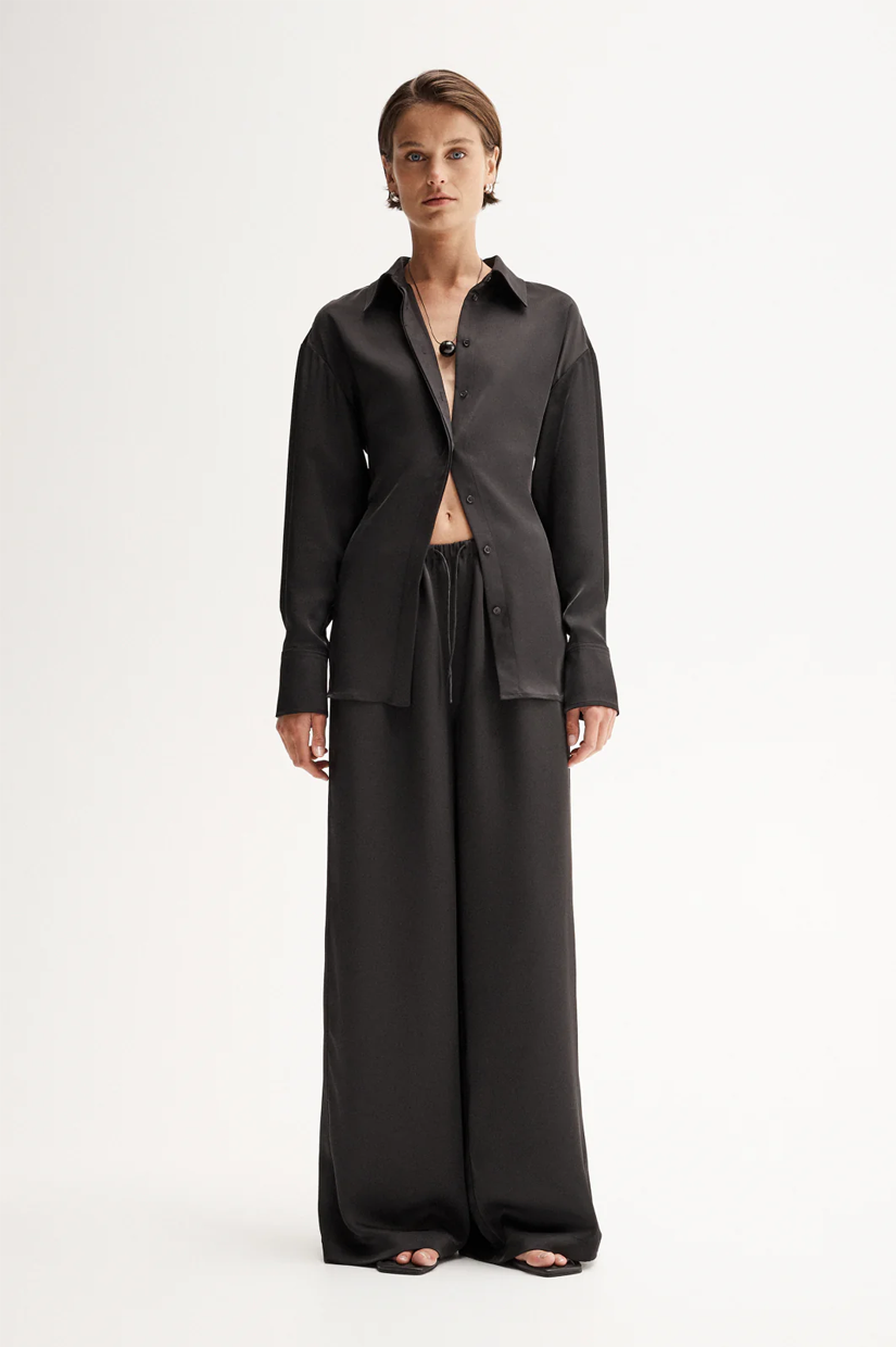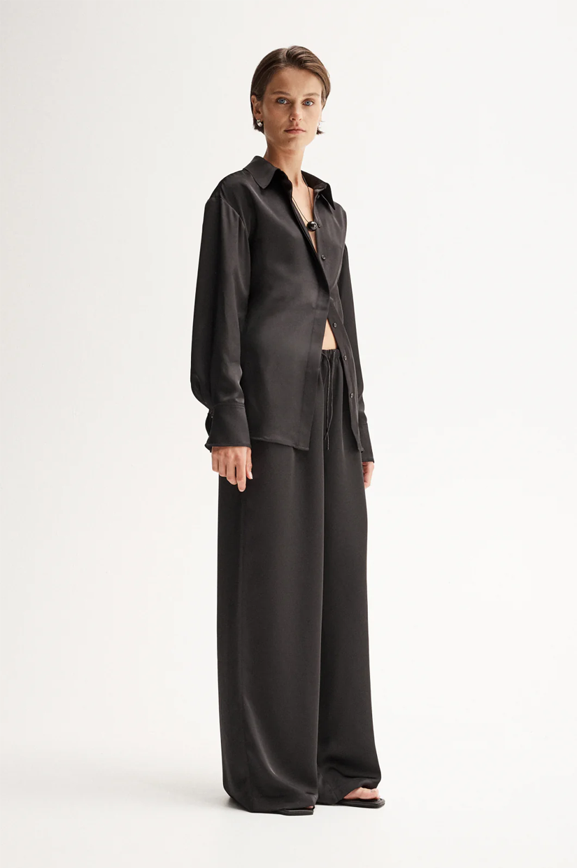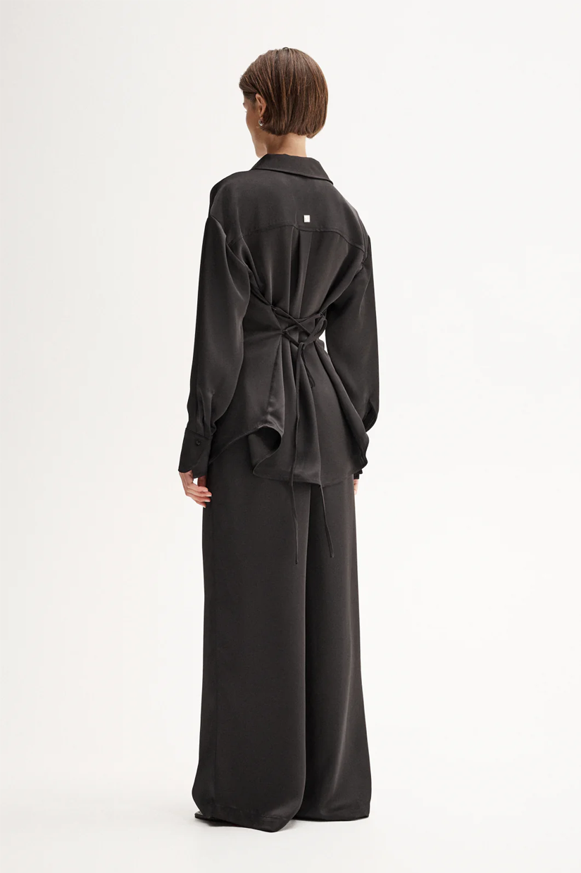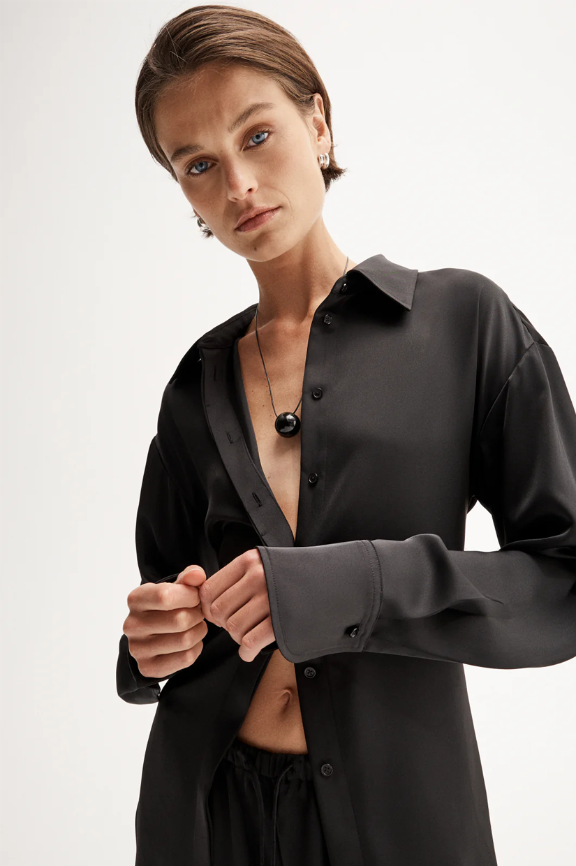 A rejuvenated favourite, the Ella Shirt is made of a luxuriously soft double-faced recycled Japanese satin that gives this piece a truly elevated feel. This shirt is cut to a relaxed fit with an adjustable corset tie at the back, a classic shirt collar, full length sleeve with drop shoulder and button cuffs, and a button through front.
