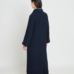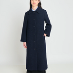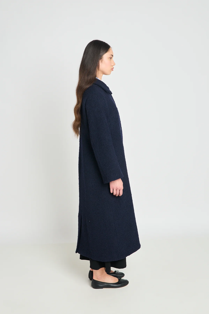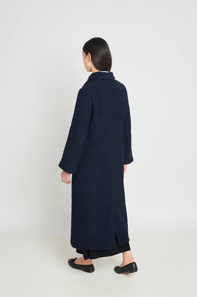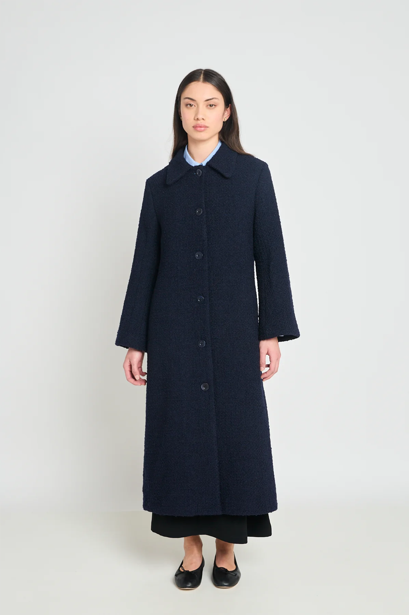Got us in a trance: The Spellbound coat is a statement piece in navy wool bouclé. Long, with a simple collar, button down front placket, in-seam pockets and flared sleeve.