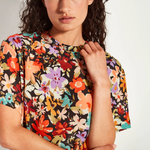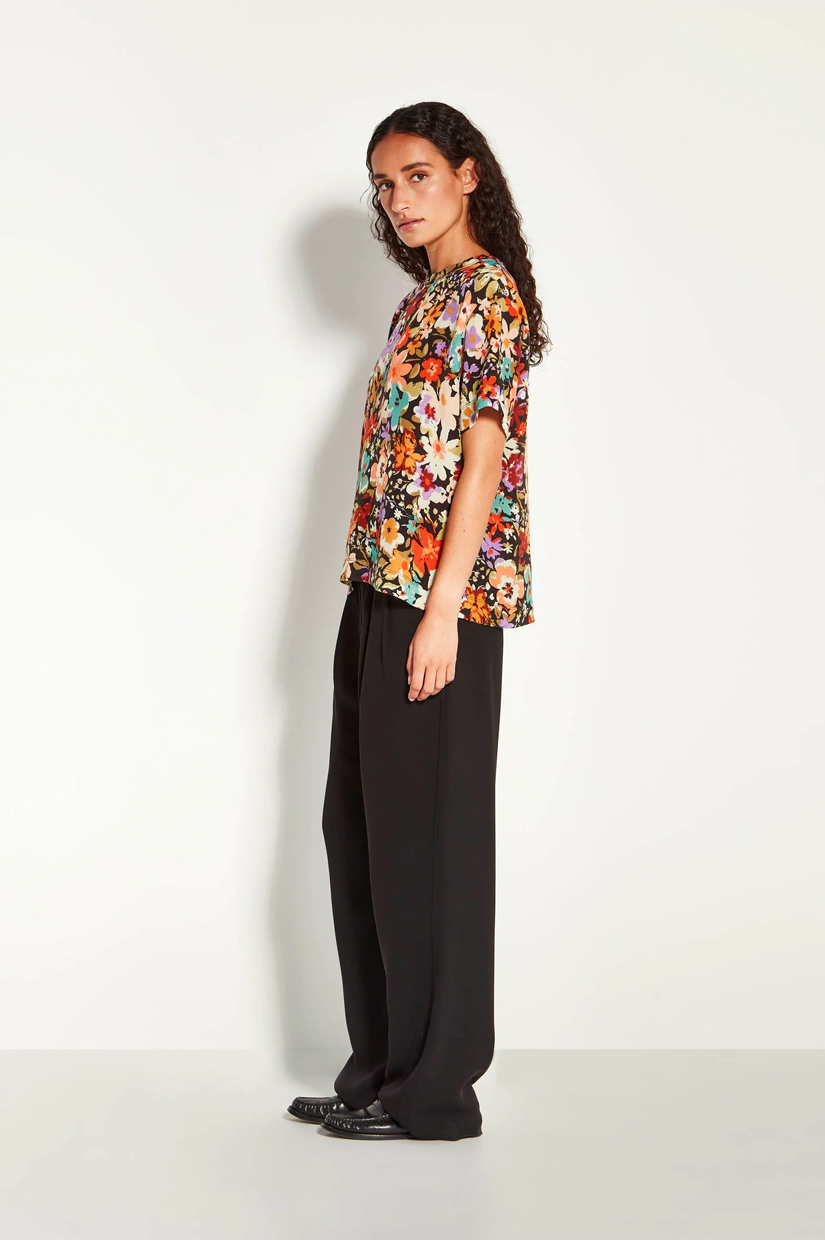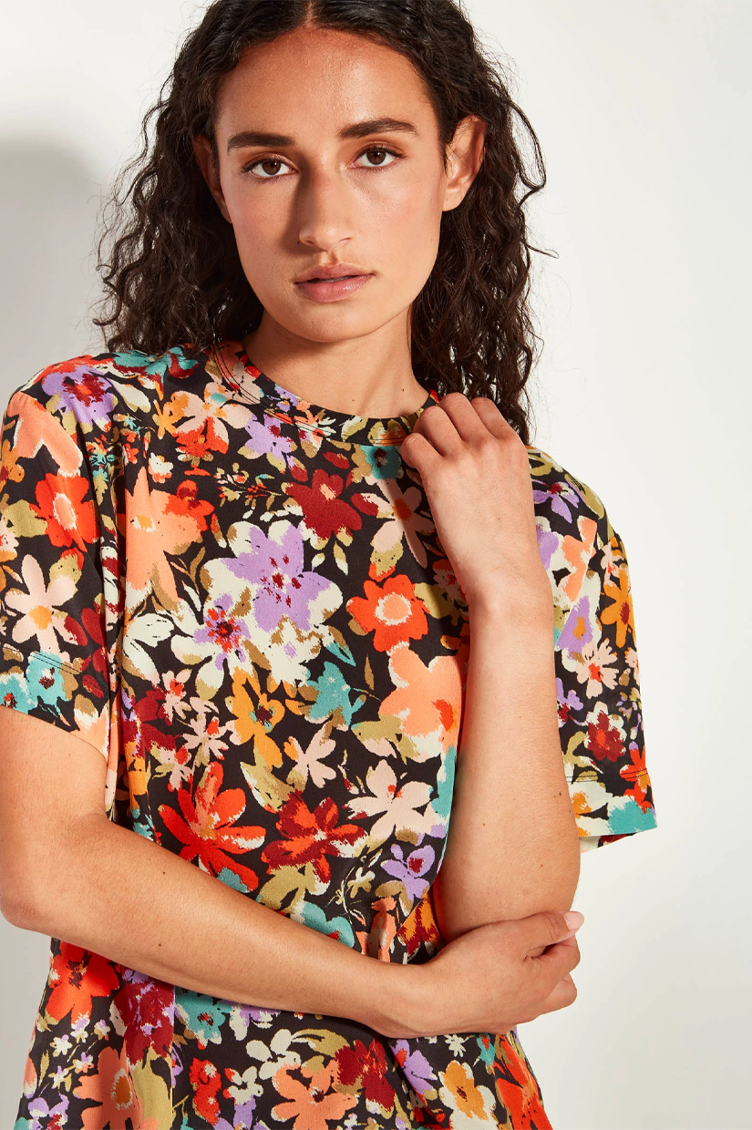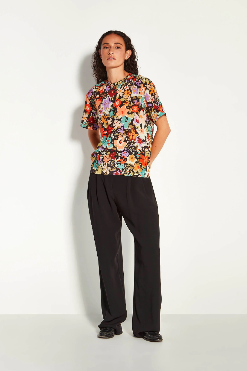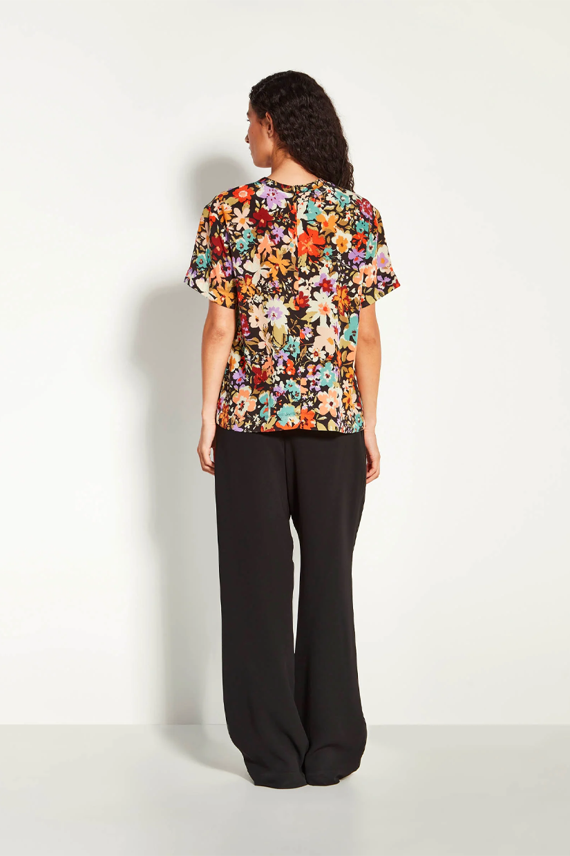 The Fancy T is a modern take on the classic T-shirt style, elevated in beautifully draping Petal Parade Silk. This boxy top features a discreet zip closure at the back of the neck and drop-shoulder T-shirt sleeves. The Fancy T is designed to be worn oversized and pairs perfectly with flowing skirts or the matching Pia Pant.