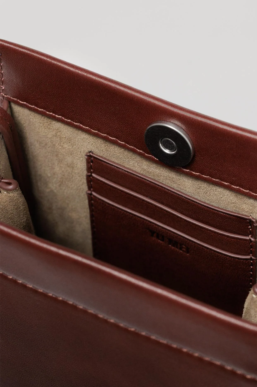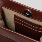A compact cross-body bag in premium Lambskin with recycled suede lining. Designed to carry light essentials and keep its wearer hands-free, it features a snap close, card slots, and phone compartment.