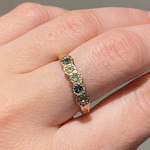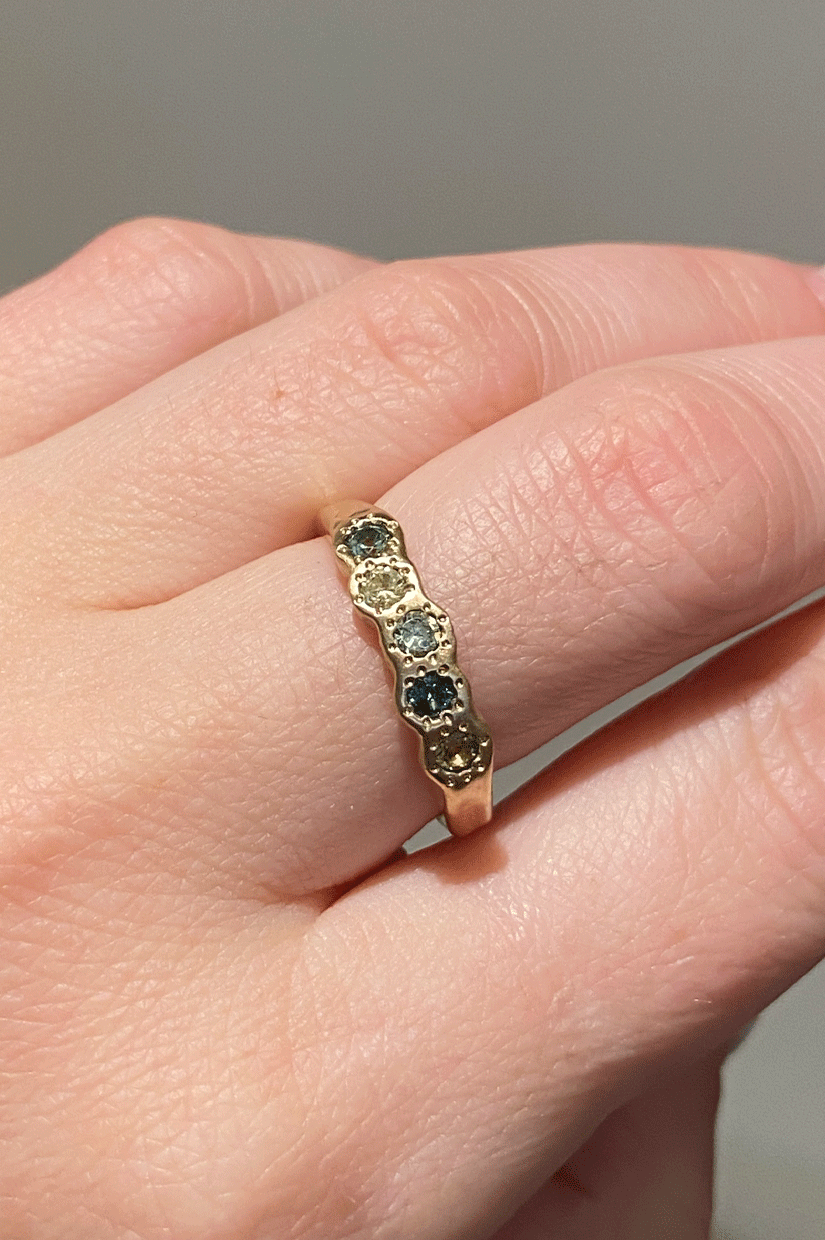 A hand carved molten band embedded with hues of Australian Green Sapphires and Diamonds