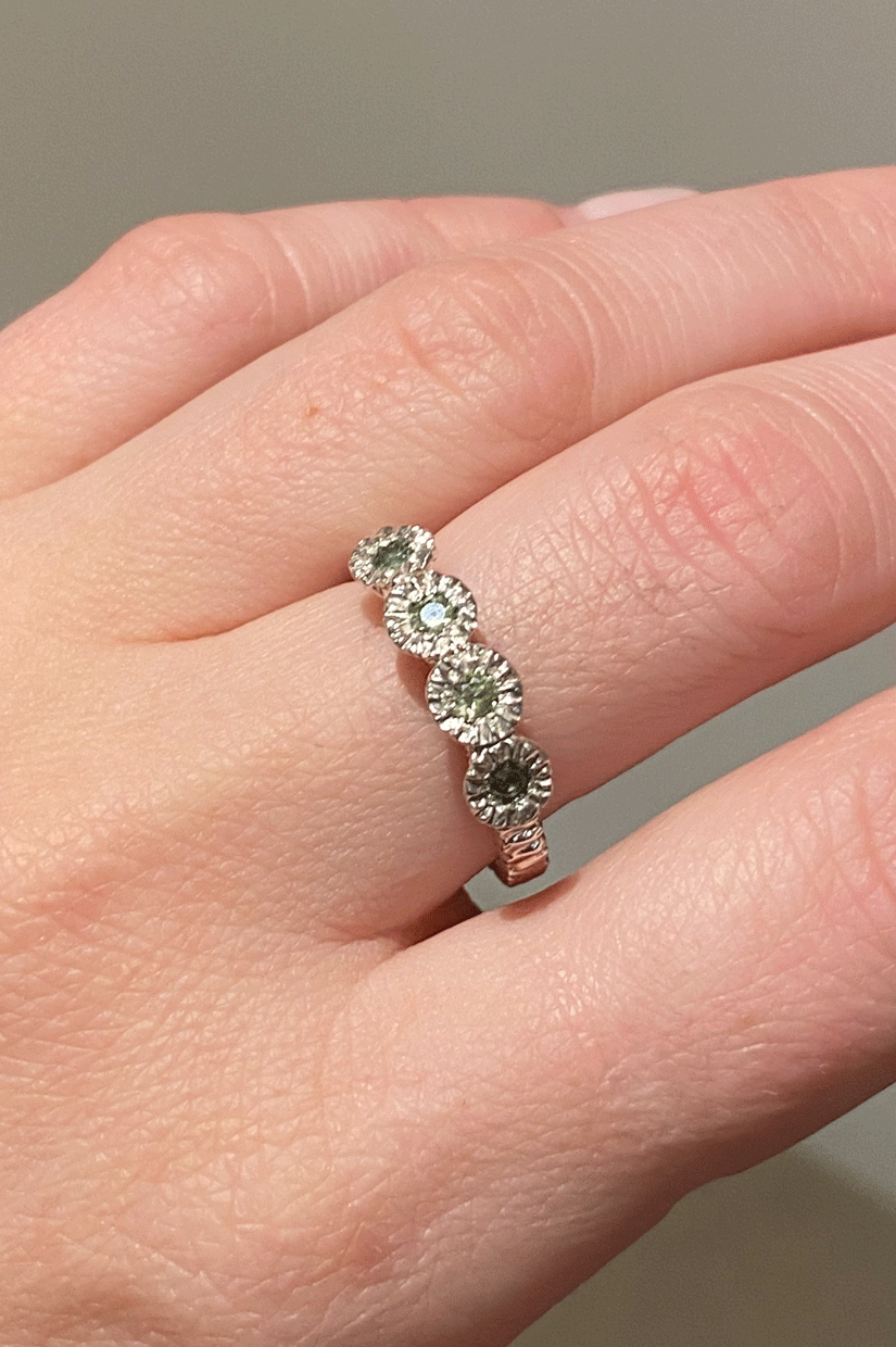 Hand carved ring featuring 4x Green sapphires set our signature teeth texture.