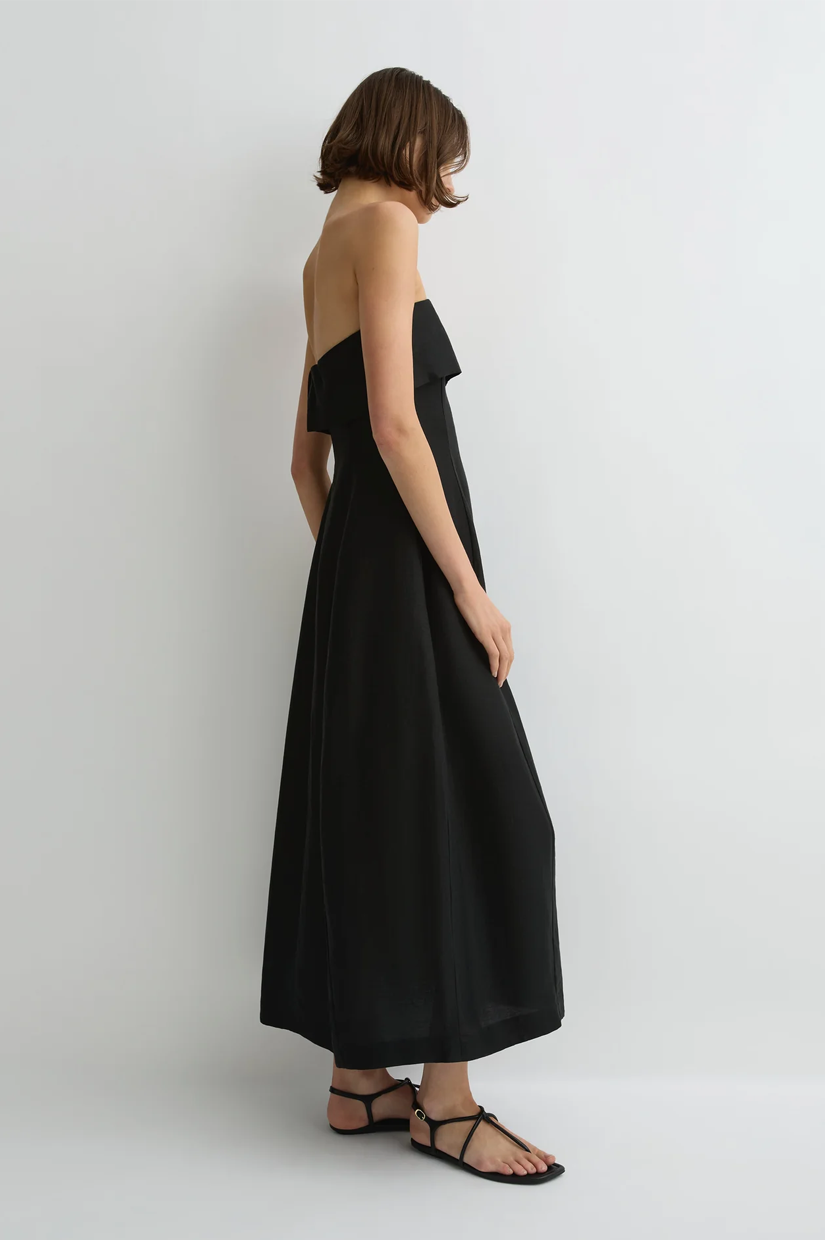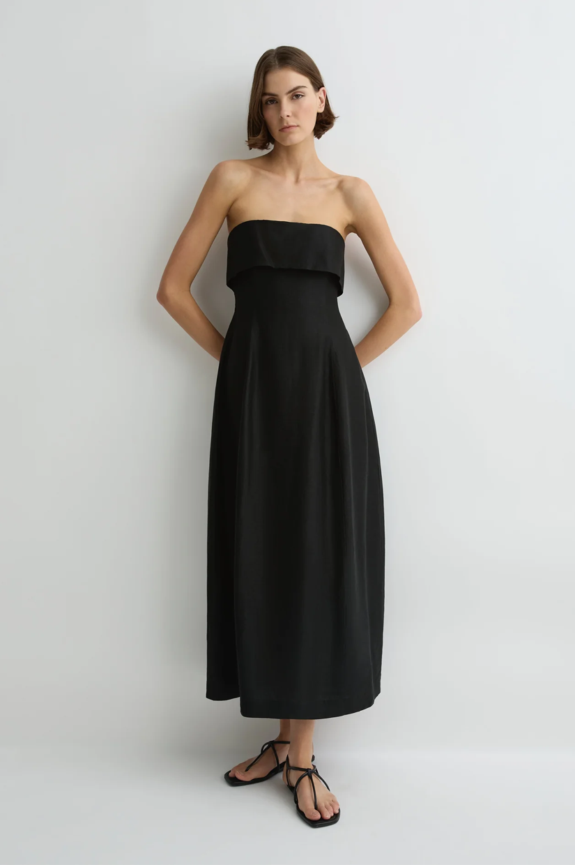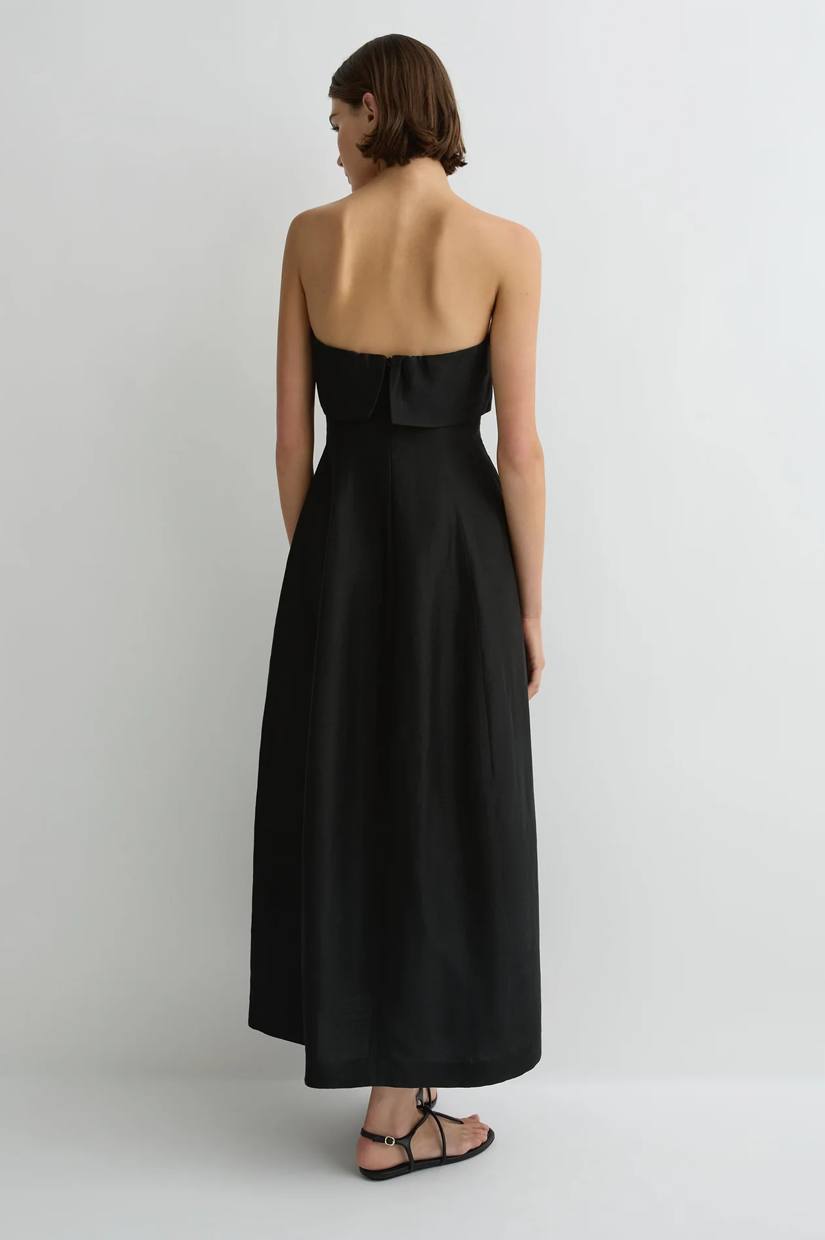 The Bormio Bandeau Maxi Dress in black is crafted from a luxurious, lightweight European linen blend with a subtle sheen. Effortlessly elegant, this timeless black dress transitions seamlessly from parties to evening occasions and special events.