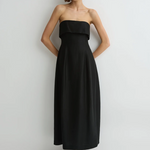 Designed for comfort and confidence, it features a fully lined, in-built corset with supportive boning, while a discreet silicone grip along the bandeau’s front edge ensures it stays perfectly in place. Precision darts contour the bodice and flow to the hipline, creating a flattering A-line silhouette with a gentle, minimal flare.