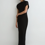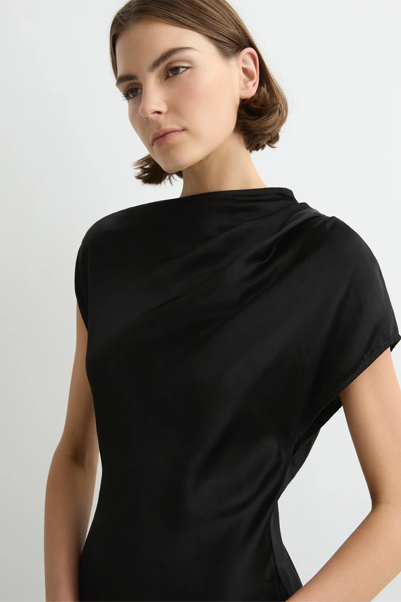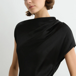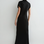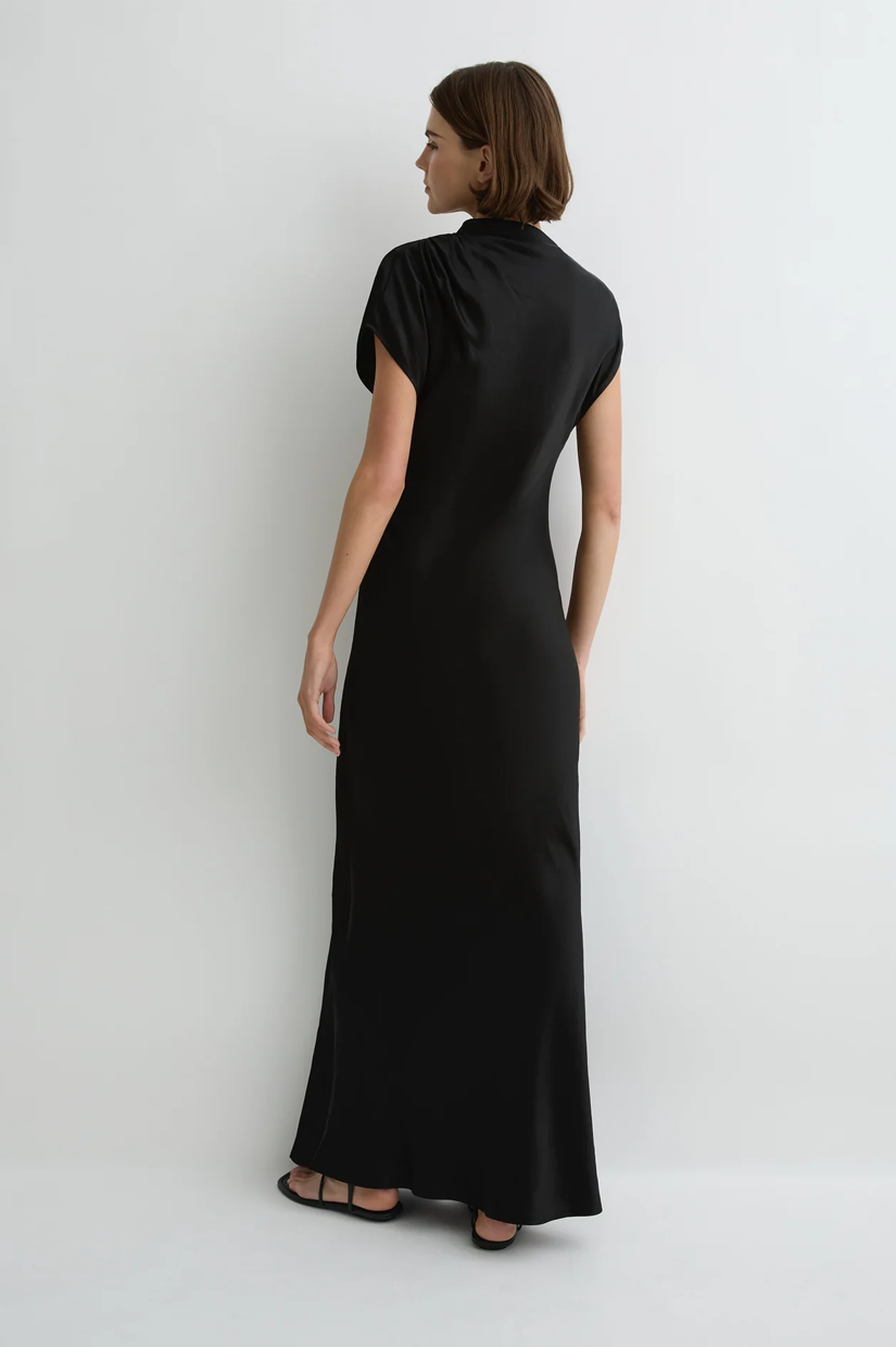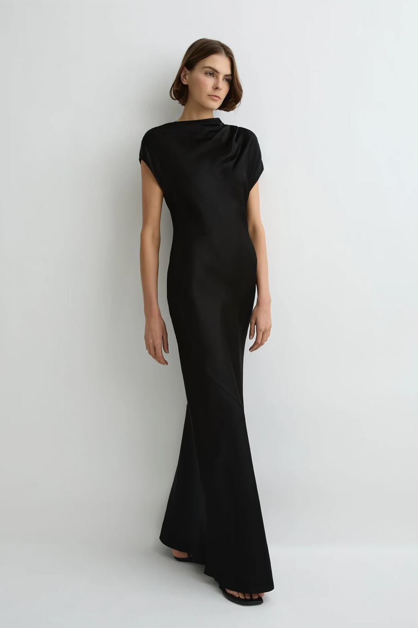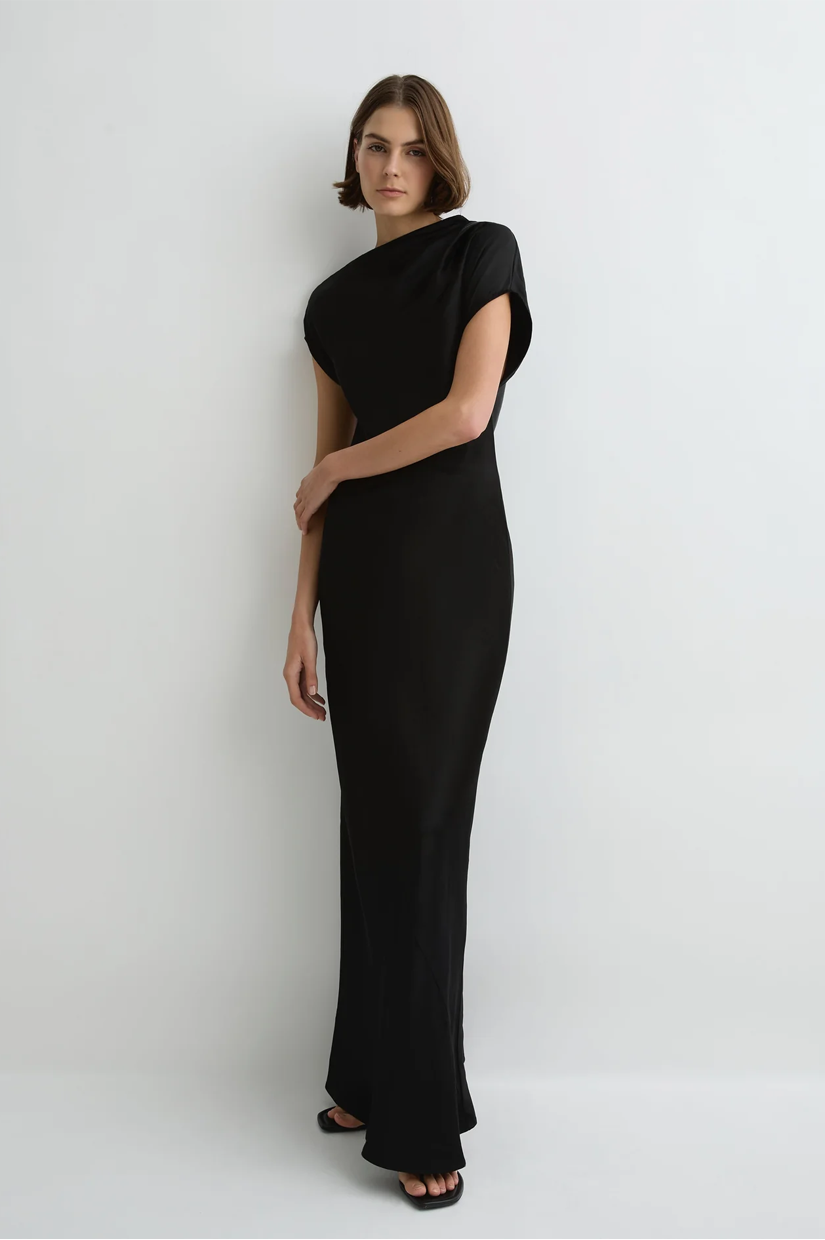 The Faro Draped Shoulder Dress in Black is cut from a luxury, sustainable linen satin blend milled in Europe, chosen for its structure and subtle sheen. This contemporary short-sleeve maxi dress features an asymmetric neckline with soft tuck pleats at the left shoulder, closing with an invisible shoulder zip. A bias-cut hemline adds fluidity and movement that skims the body, making it a chic choice for evenings and special events, and a piece that will endure in your wardrobe for years to come.