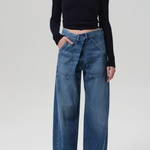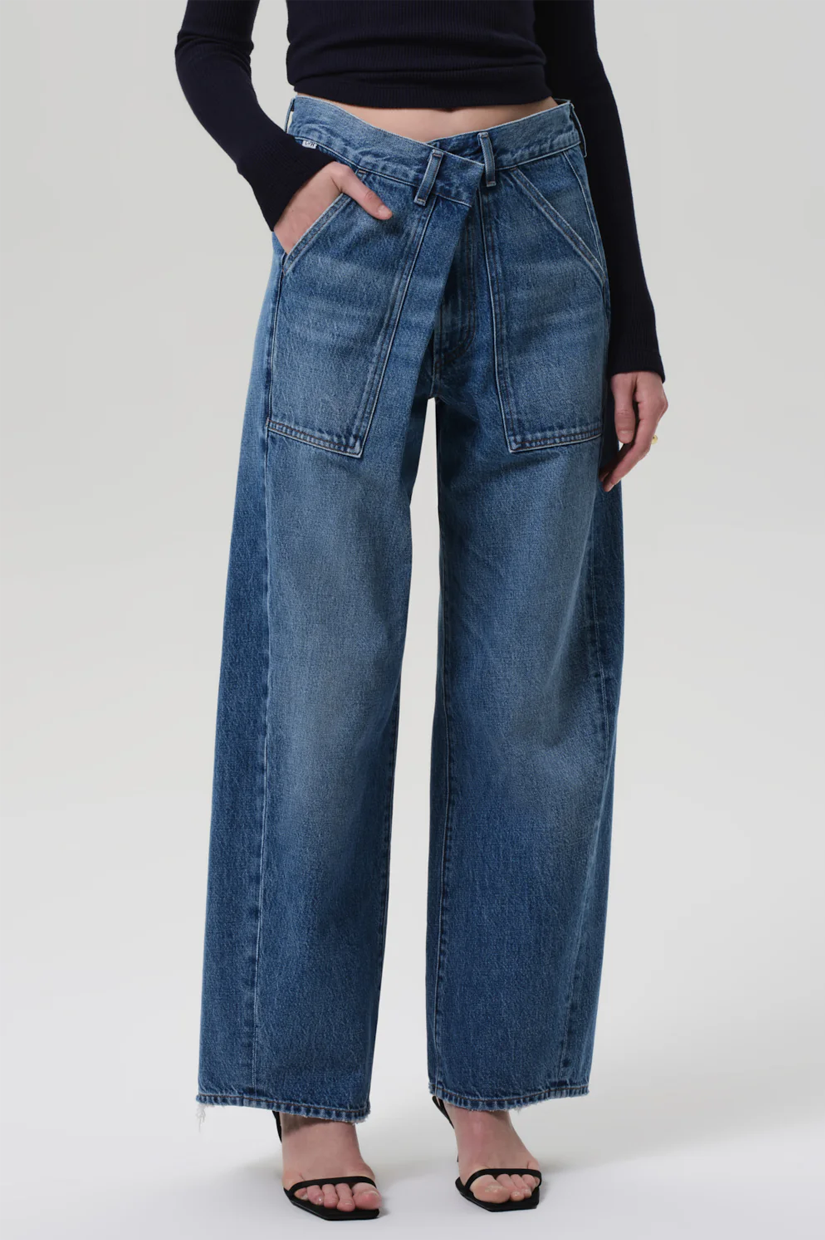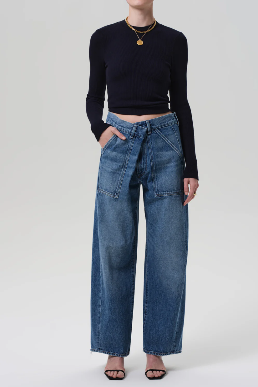 Looks Like: Medium indigo denim trouser with fold front closure and utility pockets