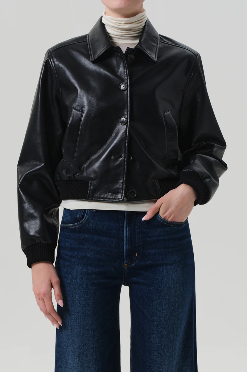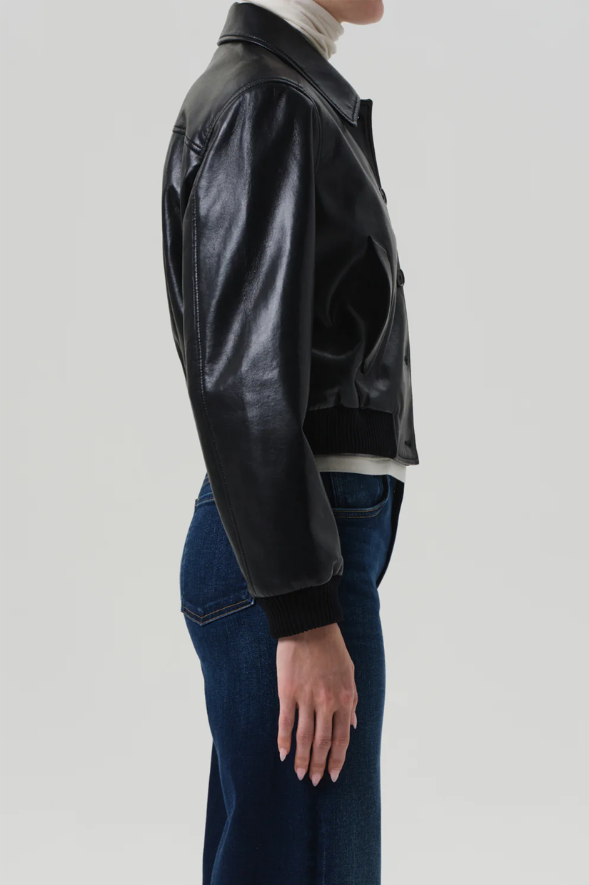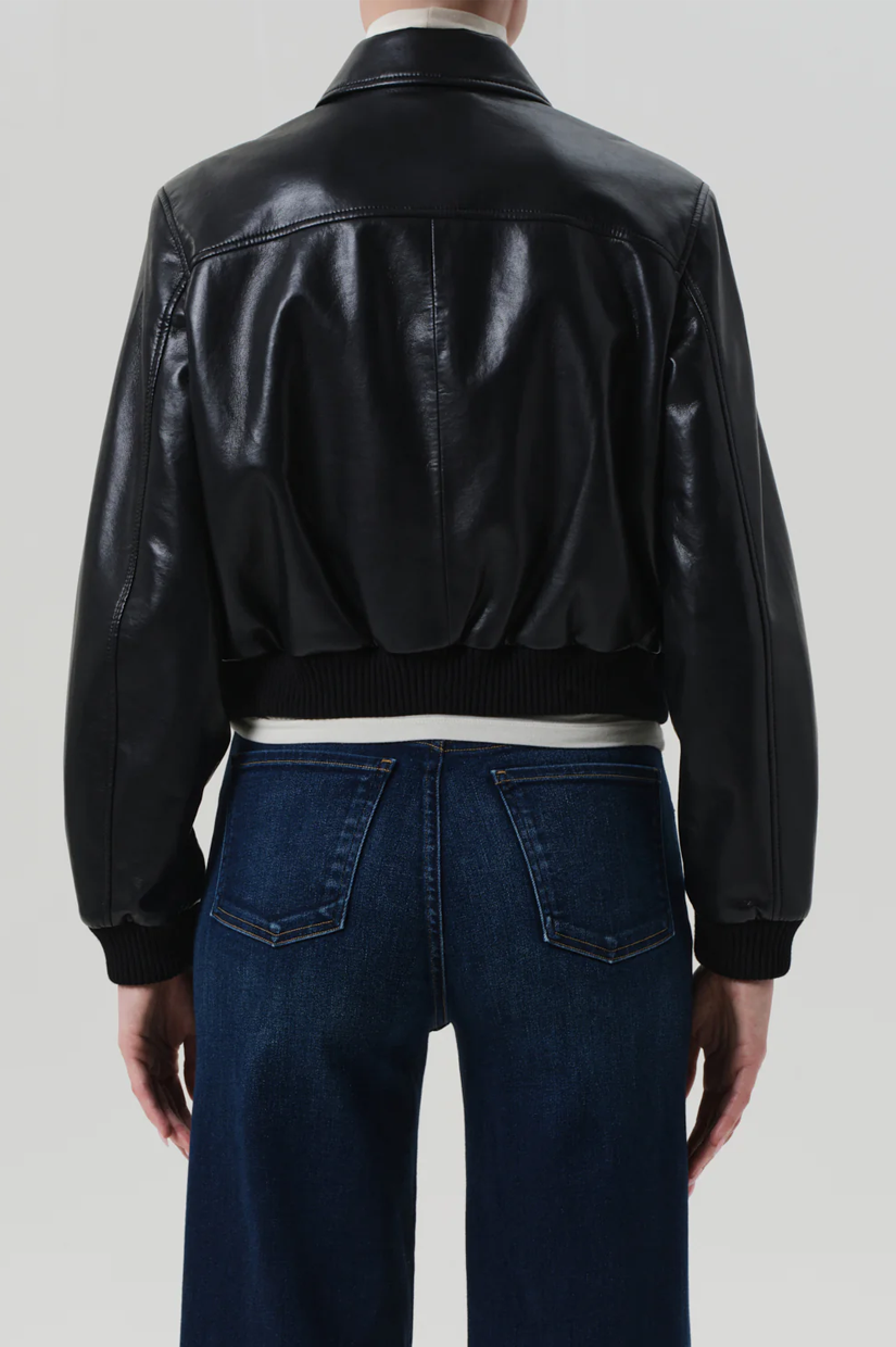 Looks Like: Luxurious cropped black leather bomber jacket