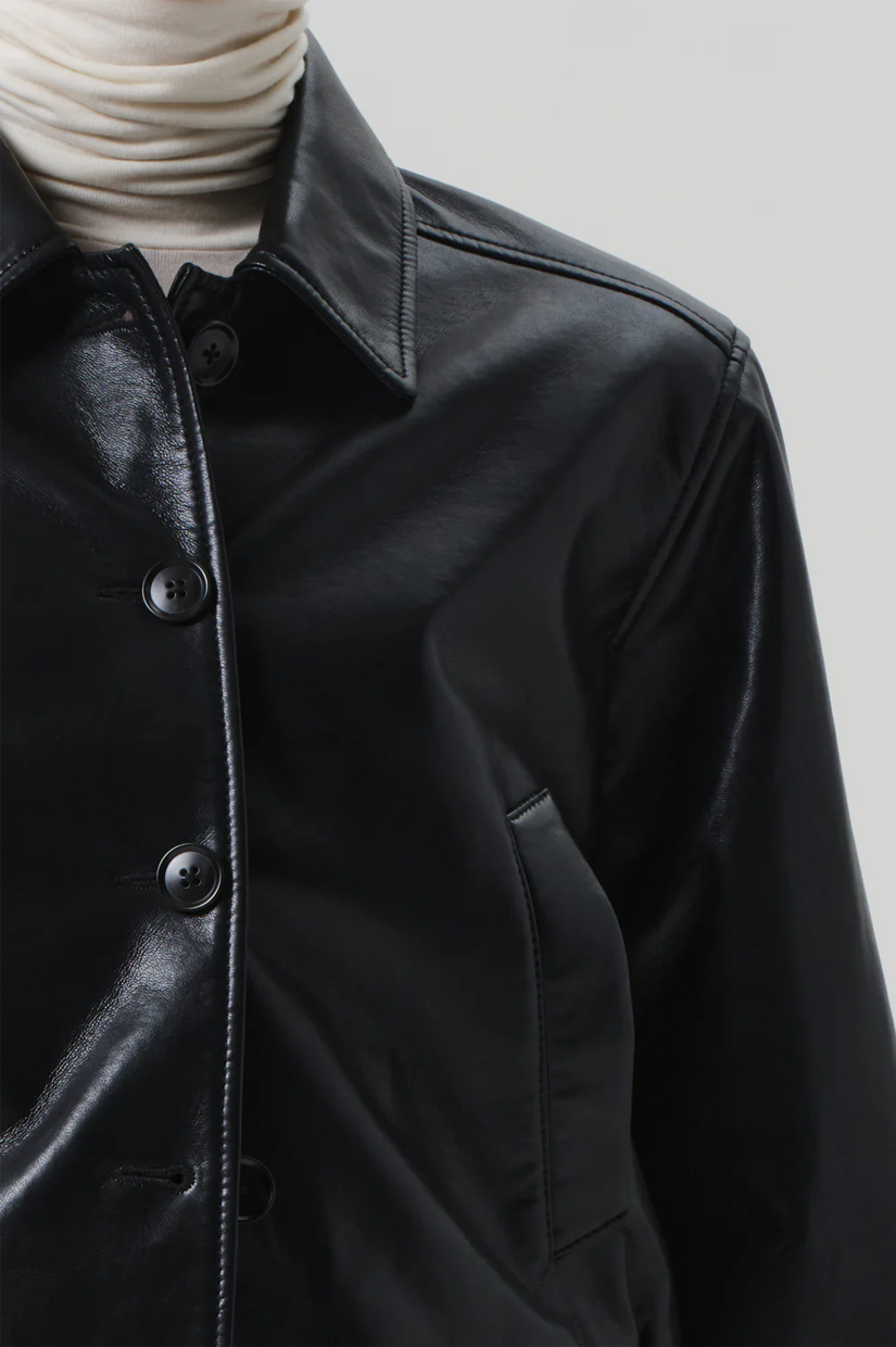 The ‘Lola’ is a cropped leather bomber with a clean, structured silhouette. Crafted from buttery recycled leather that’s cool to the touch, it offers a modern take on a timeless staple. True black adds polish and versatility—ideal layered over everything from denim to slip dresses.