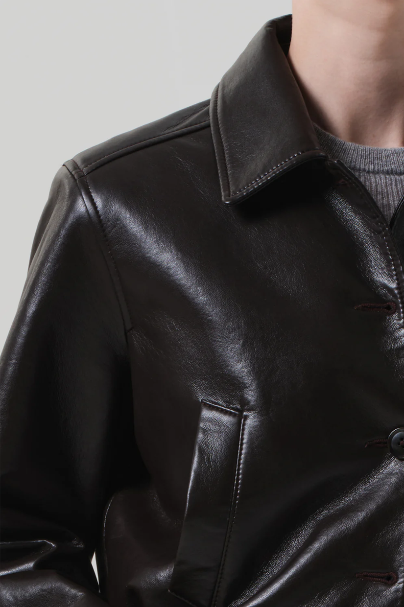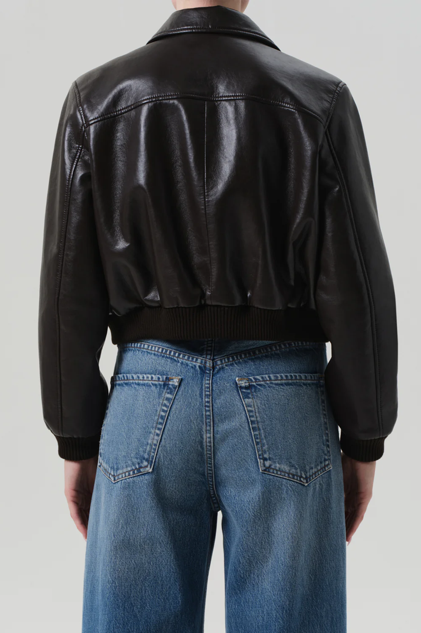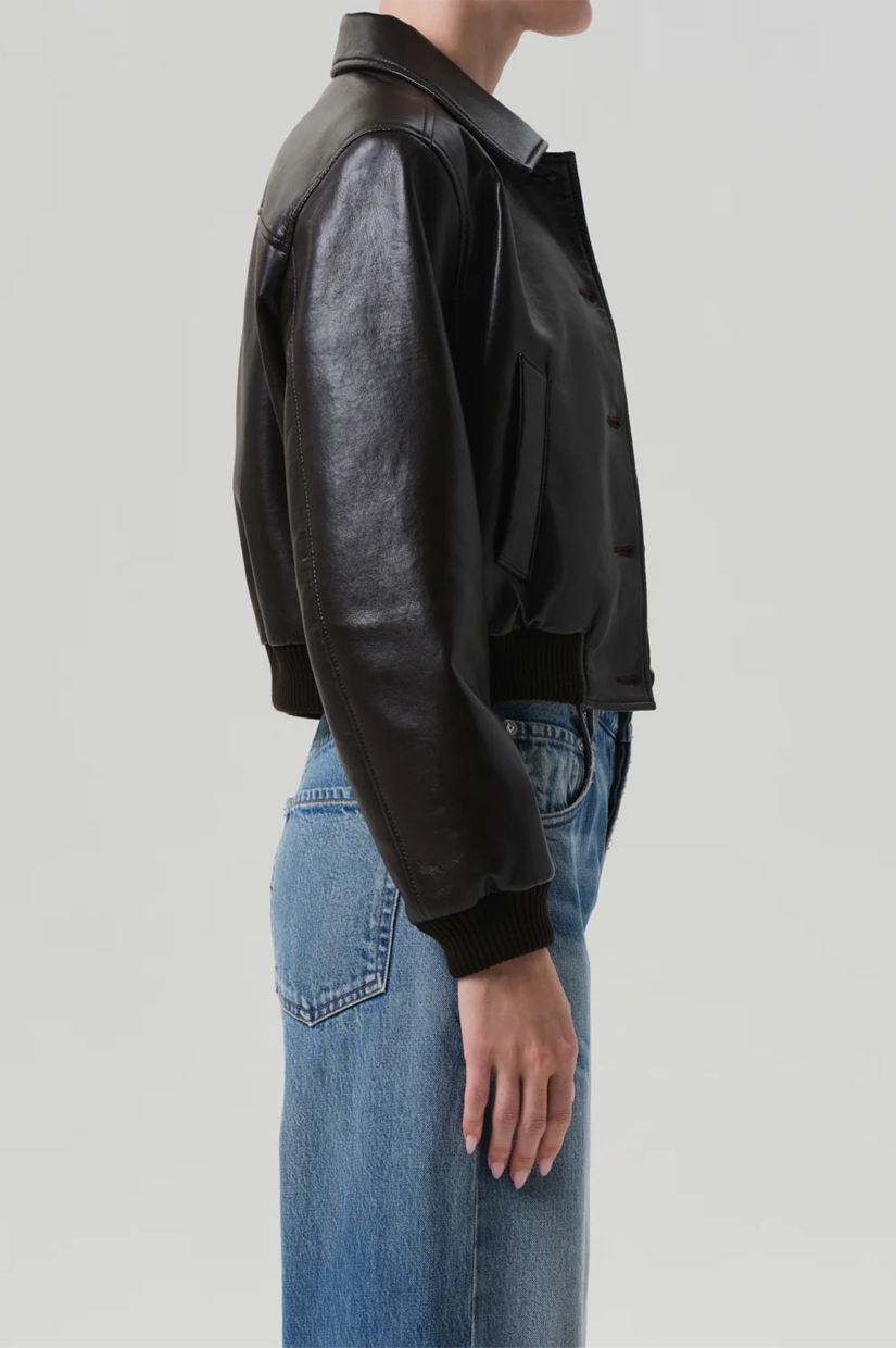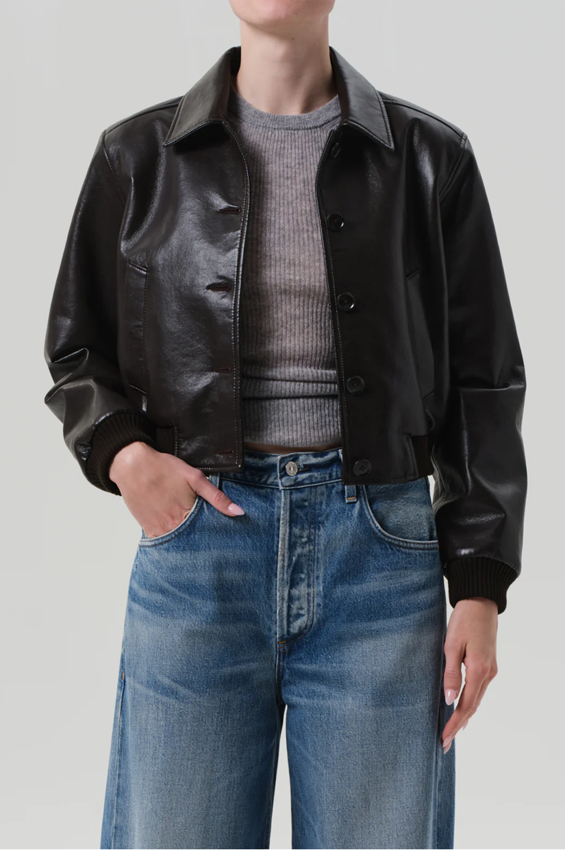 Looks Like: Luxurious cropped chocolate leather bomber jacket