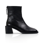 A modern ankle boot featuring a sculpted square toe and stacked heel. Crafted in supple black leather for a directional yet wearable look. Fits true to size.