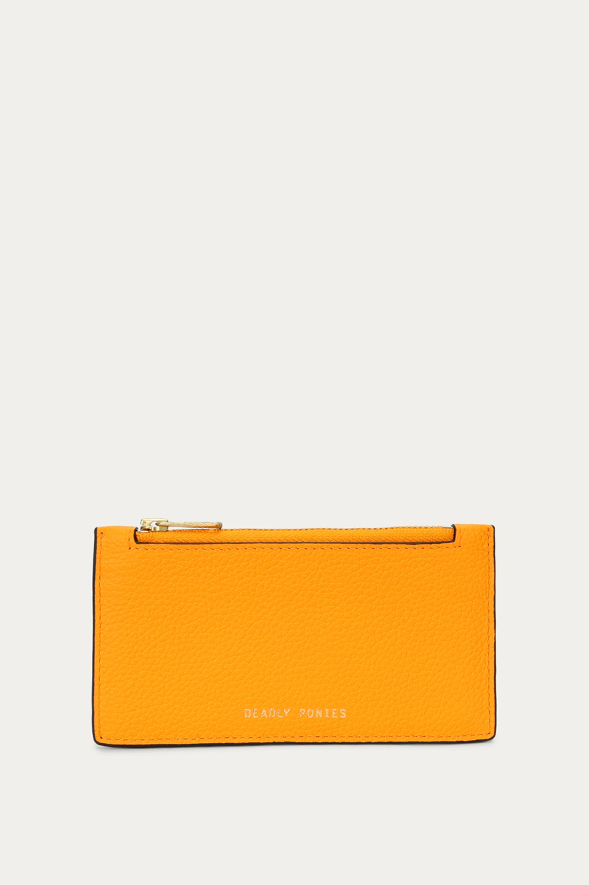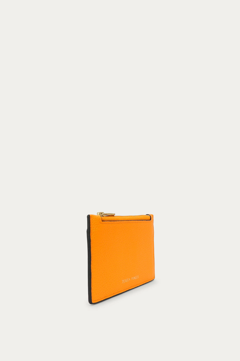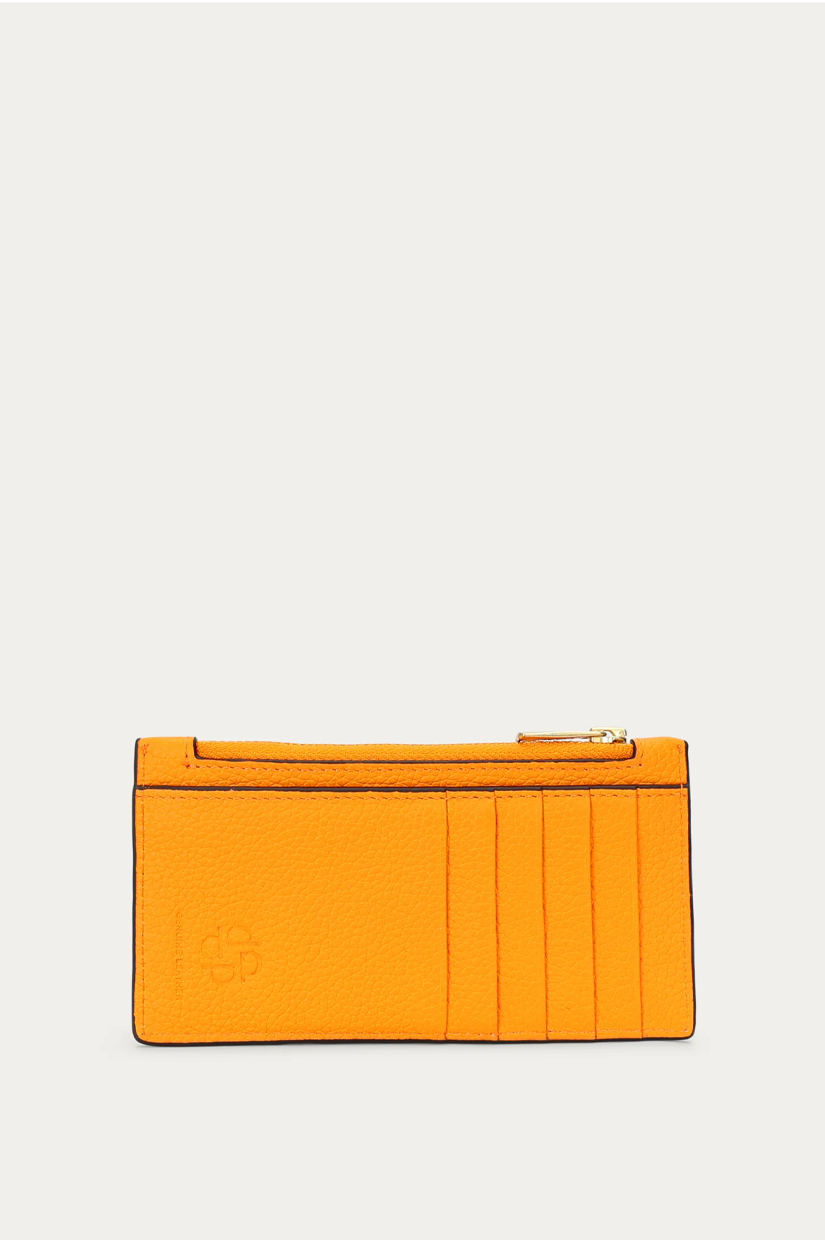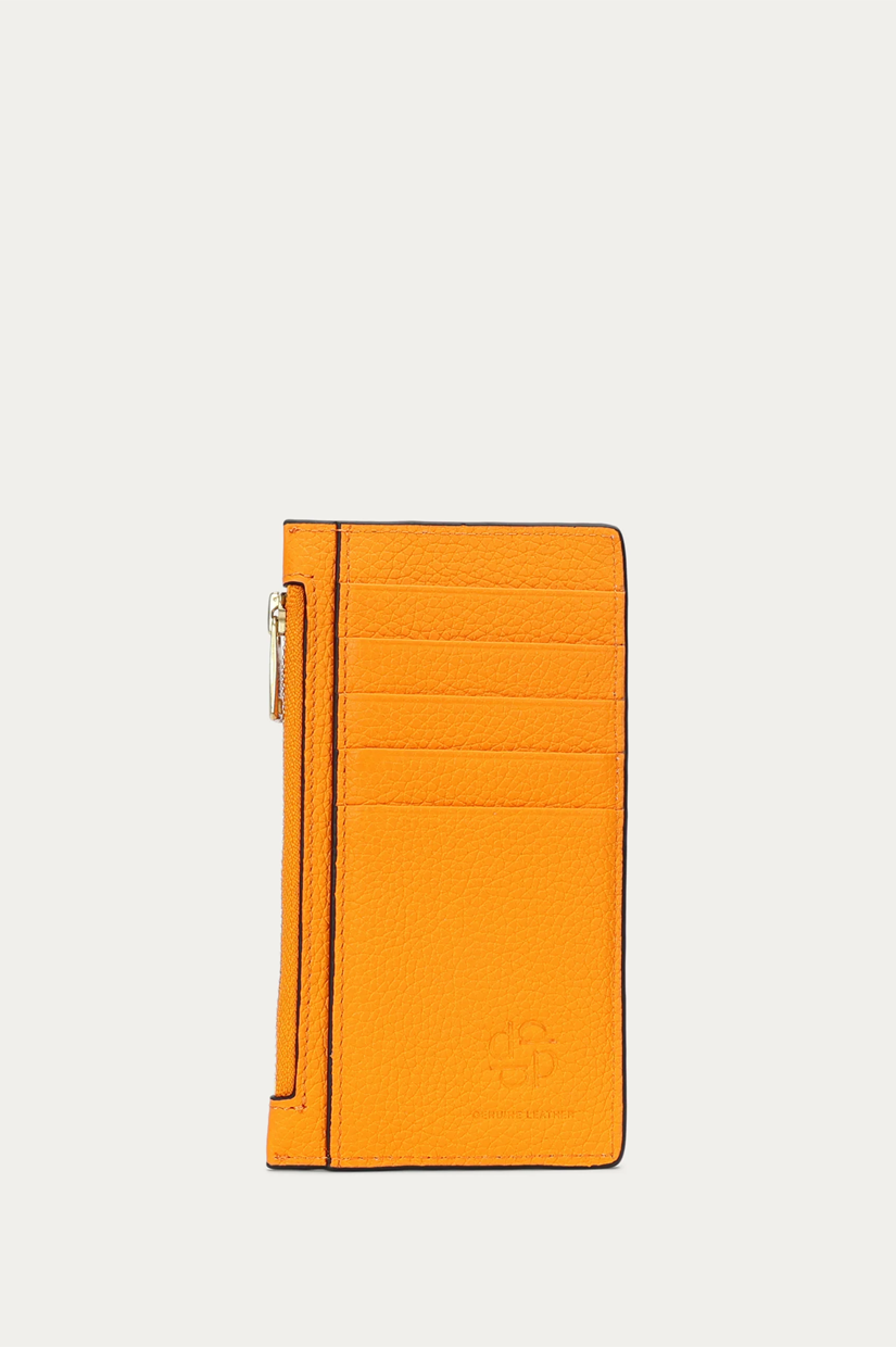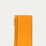 Card Holder in Marmalade is crafted from Grained Calf Leather with brass hardware, designed with a sleek longline profile, five card compartments, and a secure zip pocket for daily essentials.