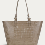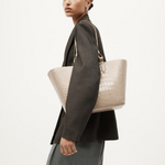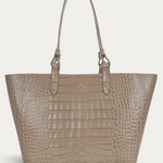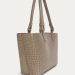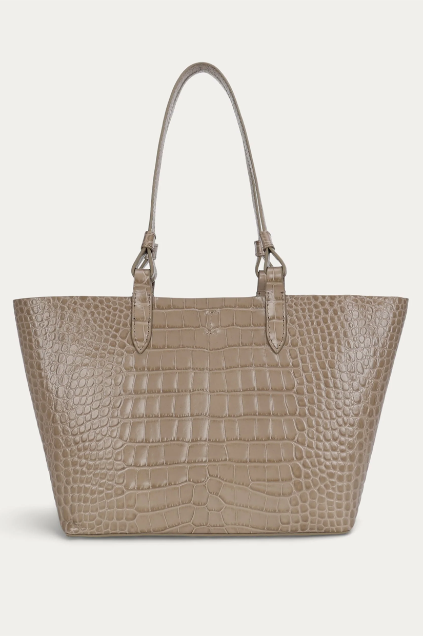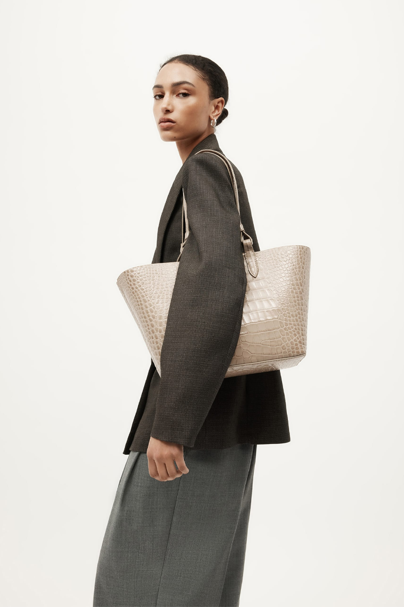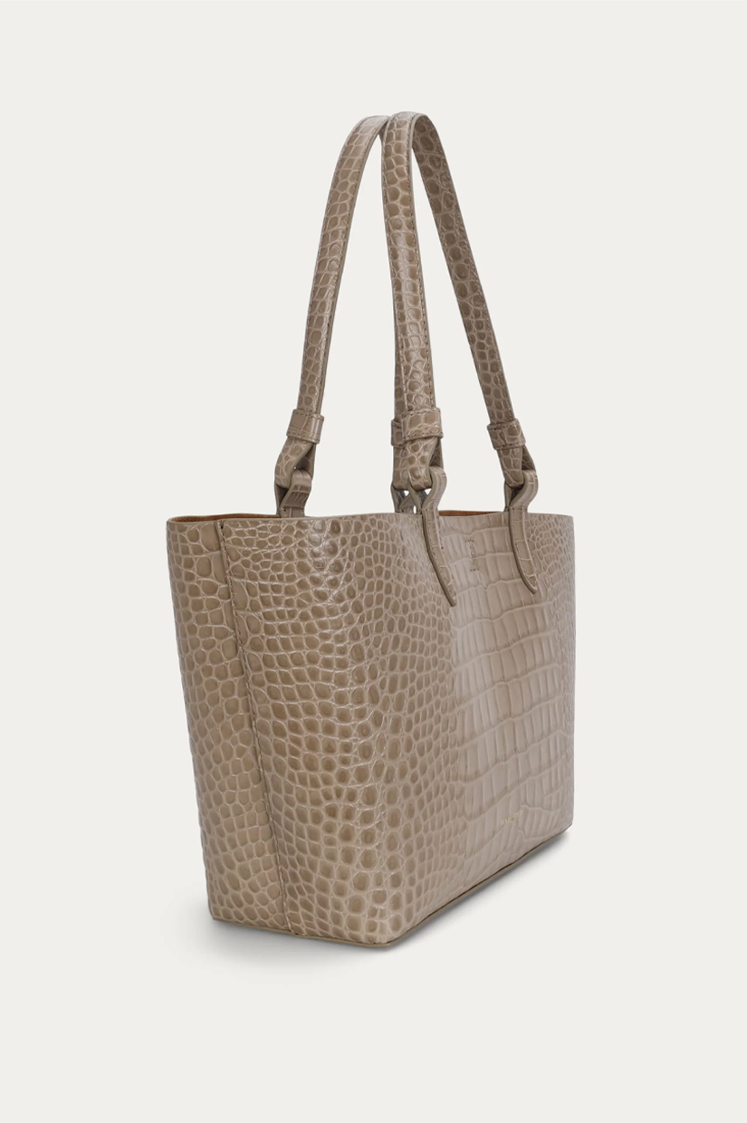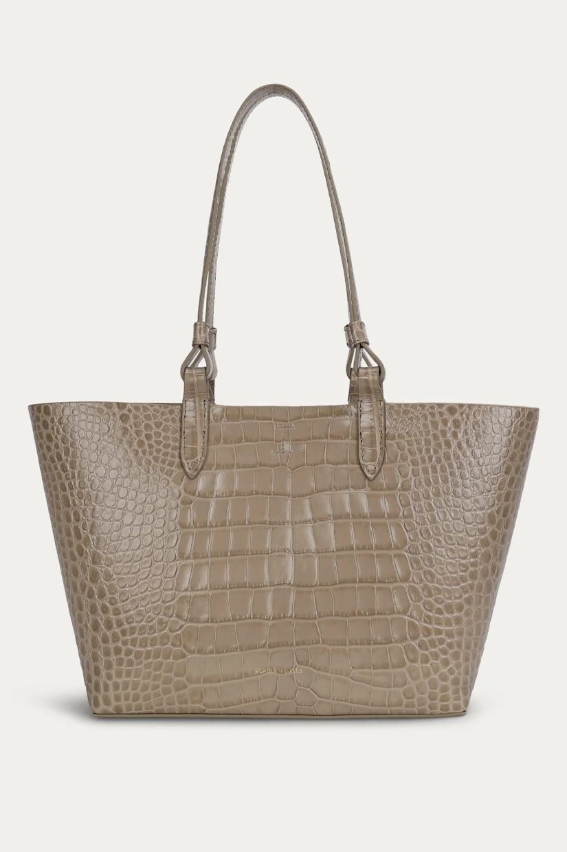 Mr Bandit Tote in Oat Croc is gently structured. Carry him by hand or on the shoulder with collapsible short and long leather loop handles. Crafted in hand-painted Croc-embossed Calf Leather with a Gingerbread Suede interior. Secured with a brass closure and internal zip compartment.