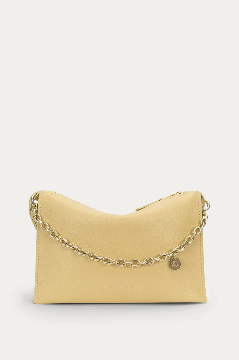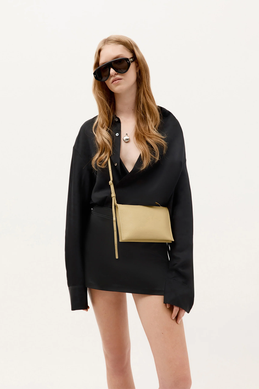 Mr Minimese is a lightweight, compact double-gusset clutch, crafted from a single piece of buttery Calf Nappa in Straw. His folded construction creates a streamlined silhouette, while a fixed adjustable strap allows him to be worn crossbody or on the shoulder.