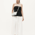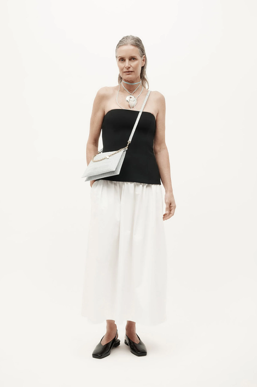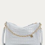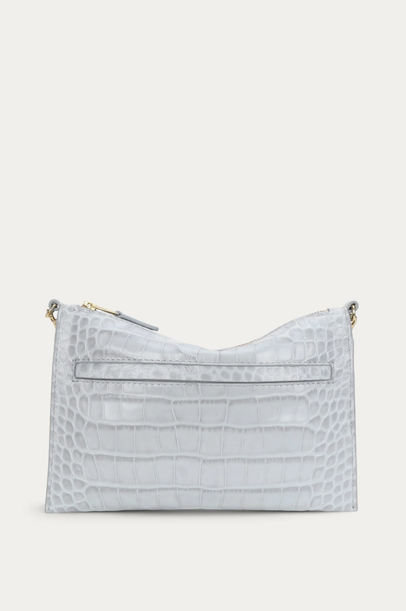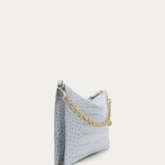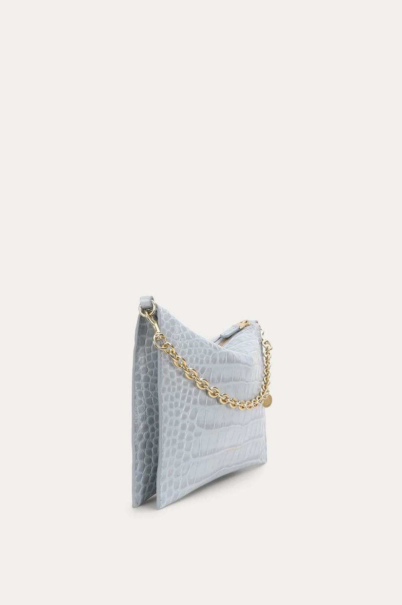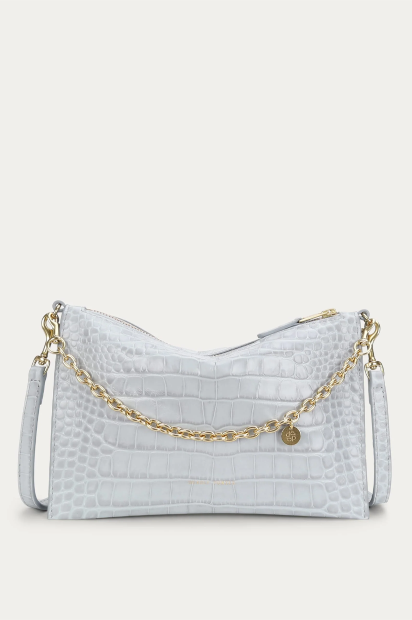 Intricately crafted from a single piece of hand-painted Croc-embossed Calf in Iceberg, Mr Siamese is defined by his streamlined silhouette. With a detachable solid brass chain and adjustable strap, he transitions seamlessly from clutch to shoulder or crossbody wear.