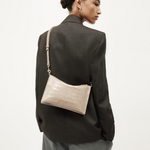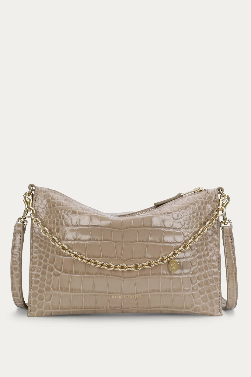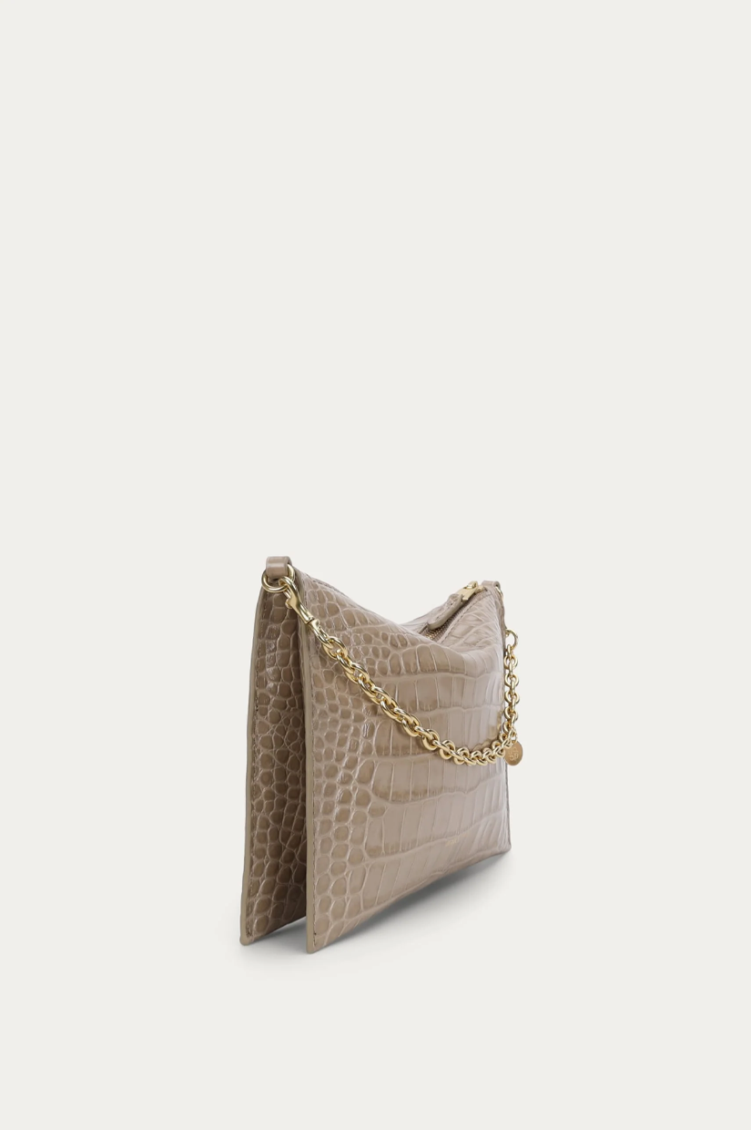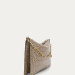 Intricately crafted from a single piece of hand-painted Croc-embossed Calf in Oat, Mr Siamese is defined by his streamlined silhouette. With a detachable solid brass chain and adjustable strap, he transitions seamlessly from clutch to shoulder or crossbody wear.
