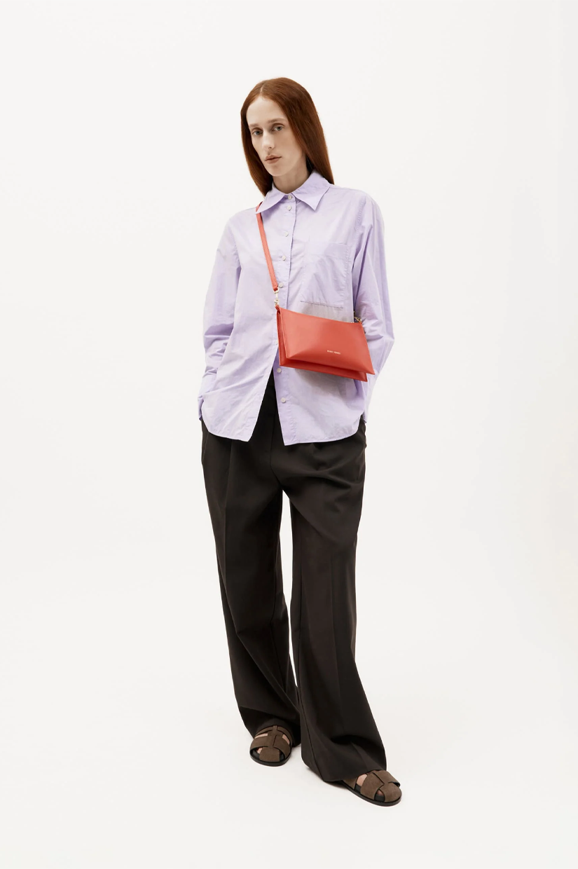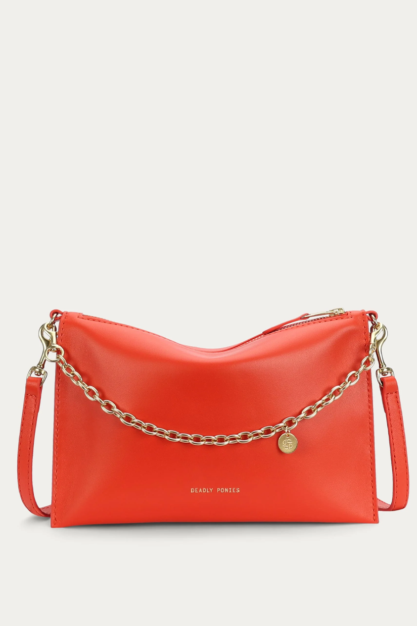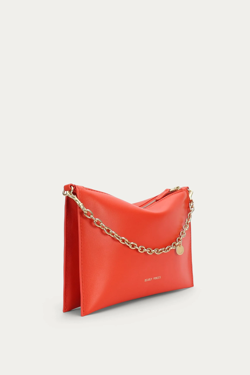 Crafted from a single piece of LWG-certified Lamb Nappa in Tamarillo, Mr Siamese is defined by his streamlined silhouette. With a detachable solid brass chain and adjustable strap, he transitions seamlessly from clutch to shoulder or crossbody wear.