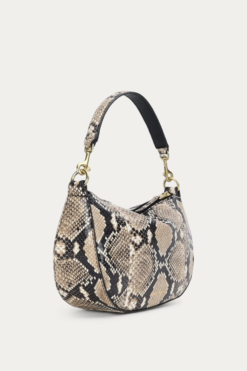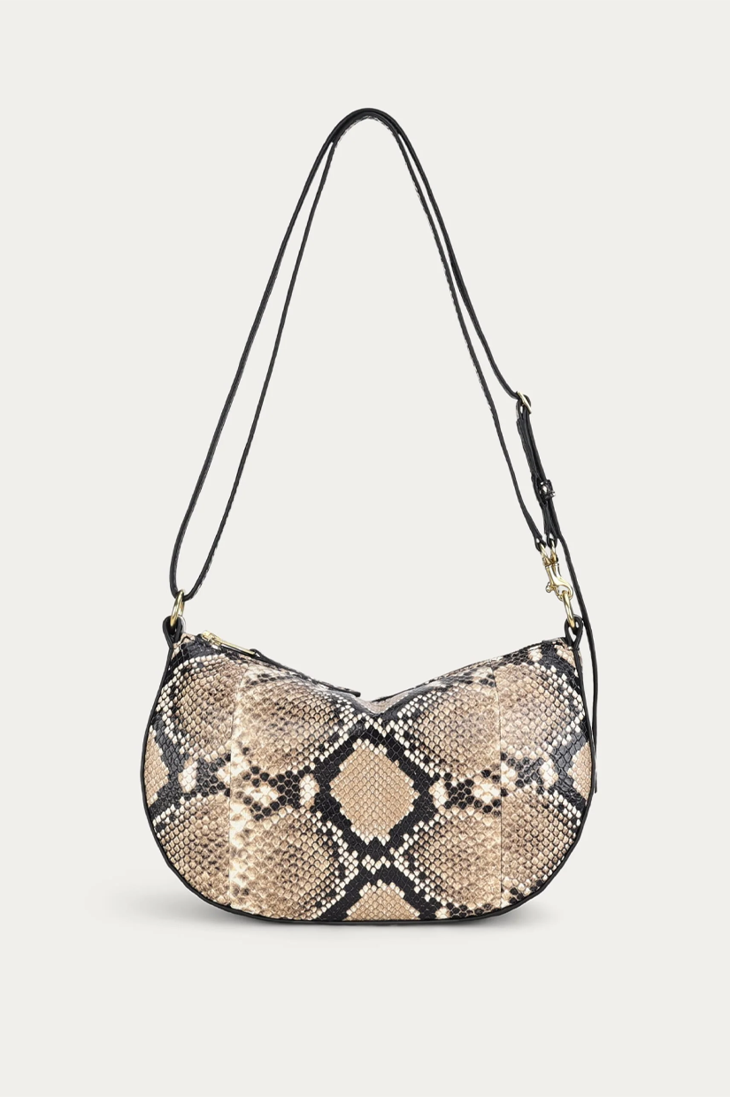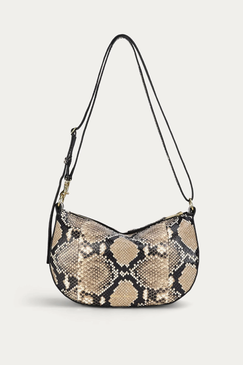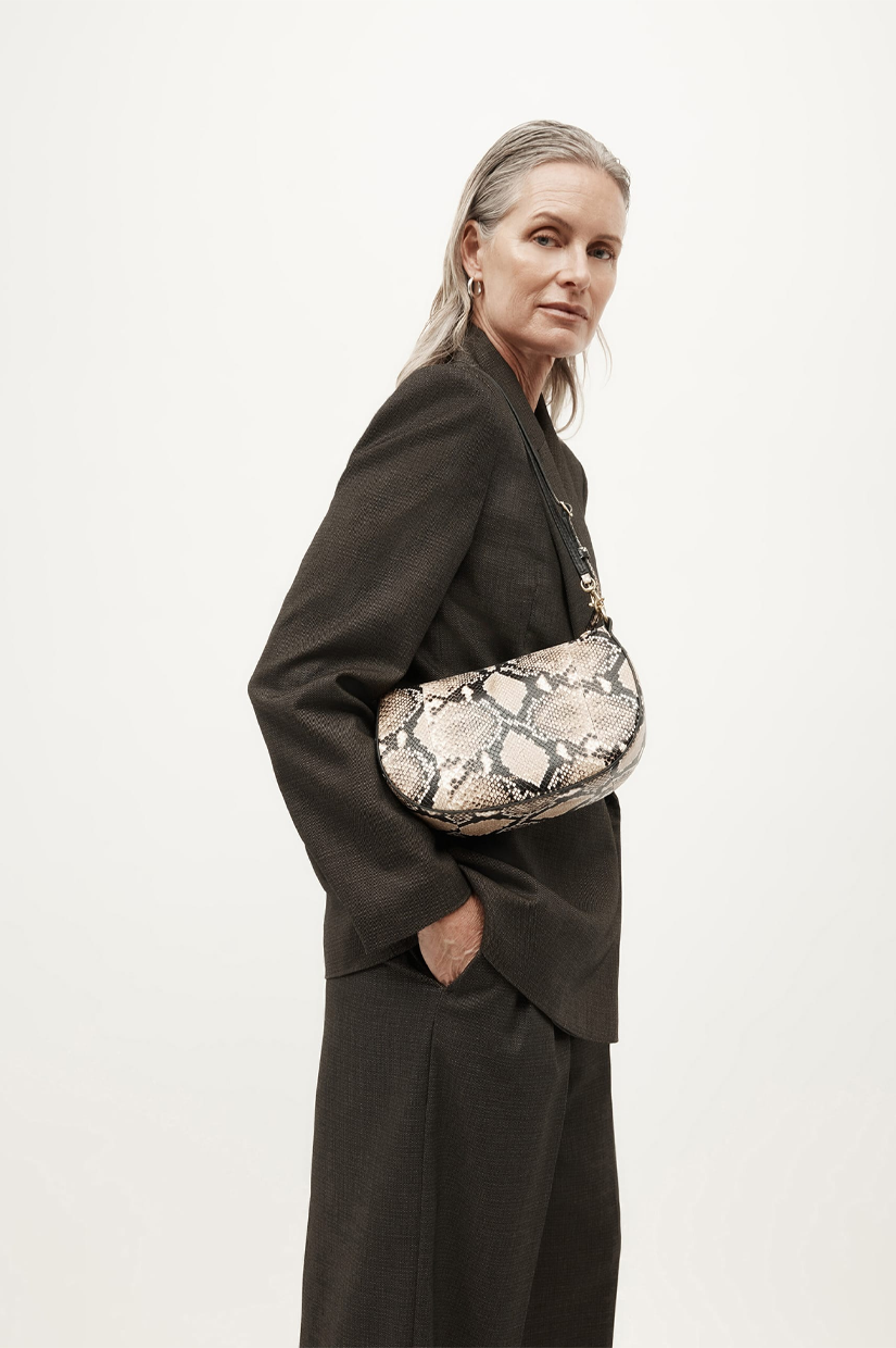 Petite in stature, Mr Sling Micro in Oat is crafted from textured Python-embossed Capra Leather. With a detachable top handle and adjustable strap, he offers versatile styling, while internal pockets and a brass zip closure keep essentials secure.