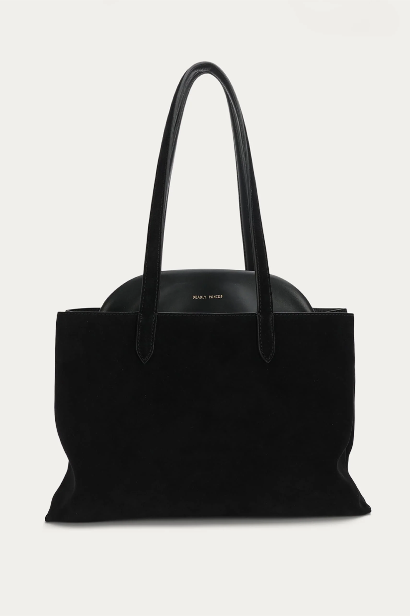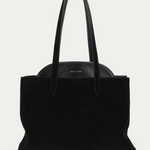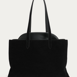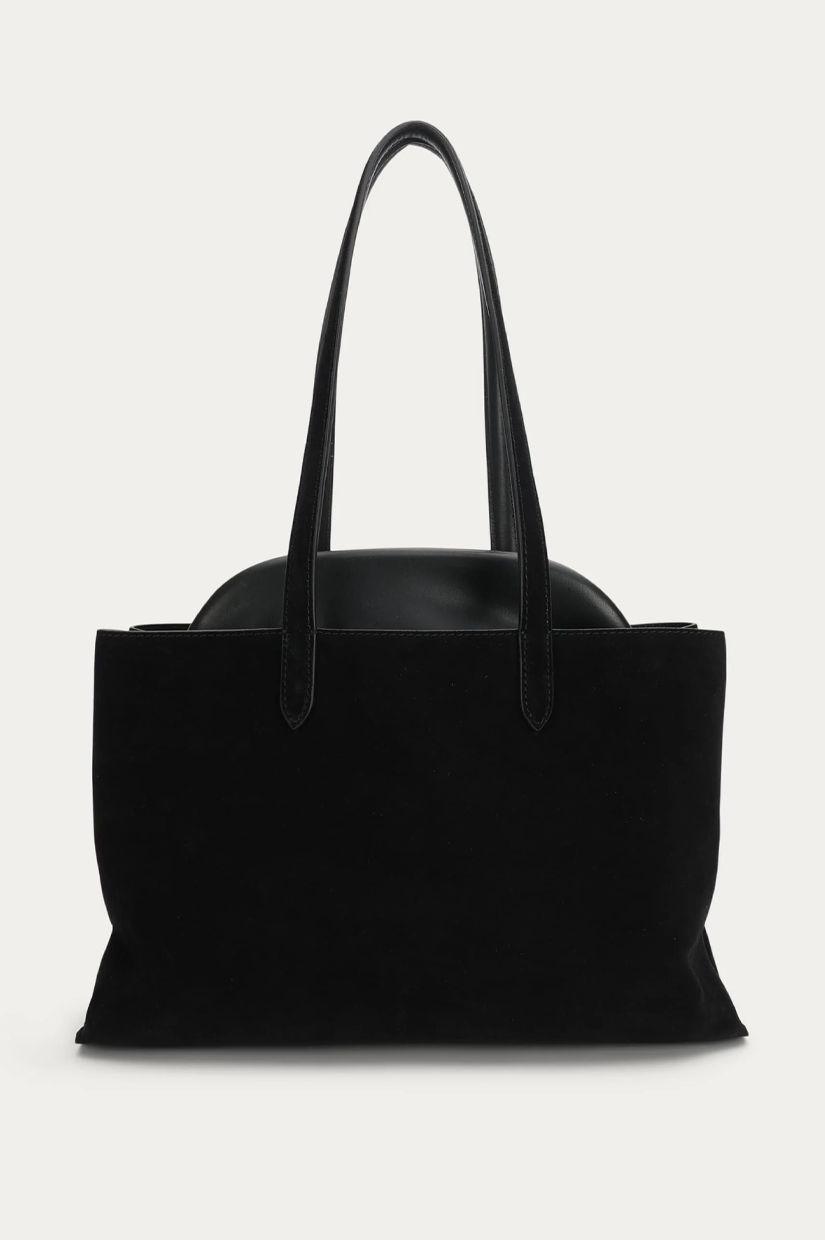 Mr Vault Tote in Black Suede is a structured carry-all, crafted from LWG-certified Calf Suede and trimmed with contrast Ironed Calf Nappa. Designed with dual fixed leather top handles and an internal metal frame at the top edge, secured by a magnetic closure. Features include front and back slip compartments that comfortably fit a 15" laptop.