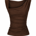 The Nevermind Singlet is a softly draped style designed with an asymmetric neckline that slopes down on one side, creating gentle folds through the fabric. The silhouette feels considered yet effortless, revealing a subtle touch of skin while remaining more covered than our deeper scoop styles.