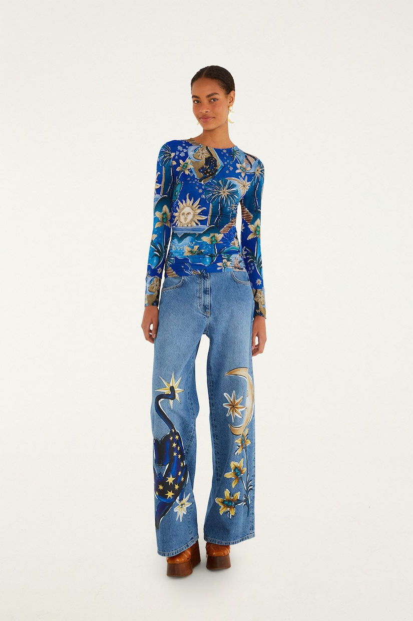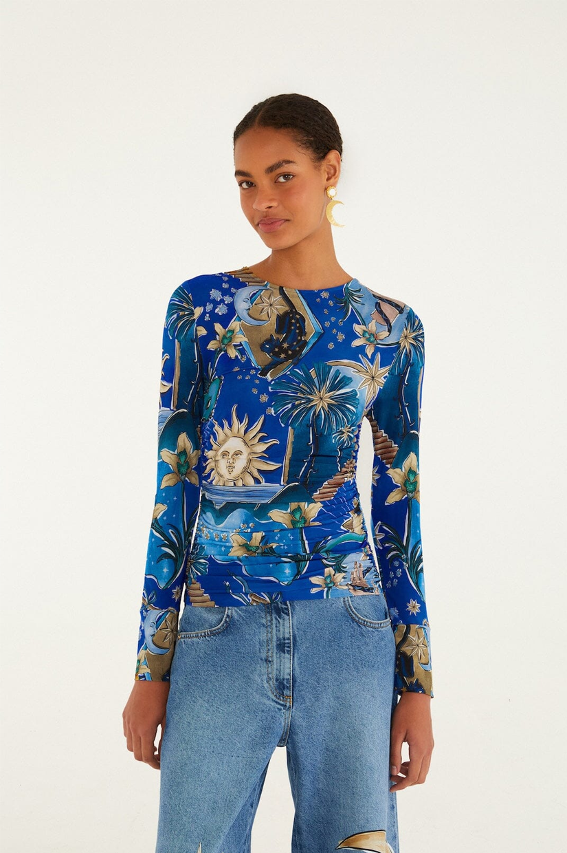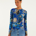 Dive into the charm of the Blue Mystical Long Sleeve Jersey Blouse by FARM Rio. Its soothing blue hues mingle with a delicate, dreamy pattern that feels both playful and serene. The soft jersey fabric drapes effortlessly over the body, while the round neckline offers a gentle embrace. Long sleeves add a graceful touch, making this blouse a perfect companion for days filled with warmth and light-hearted elegance.