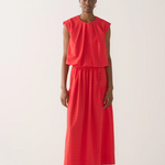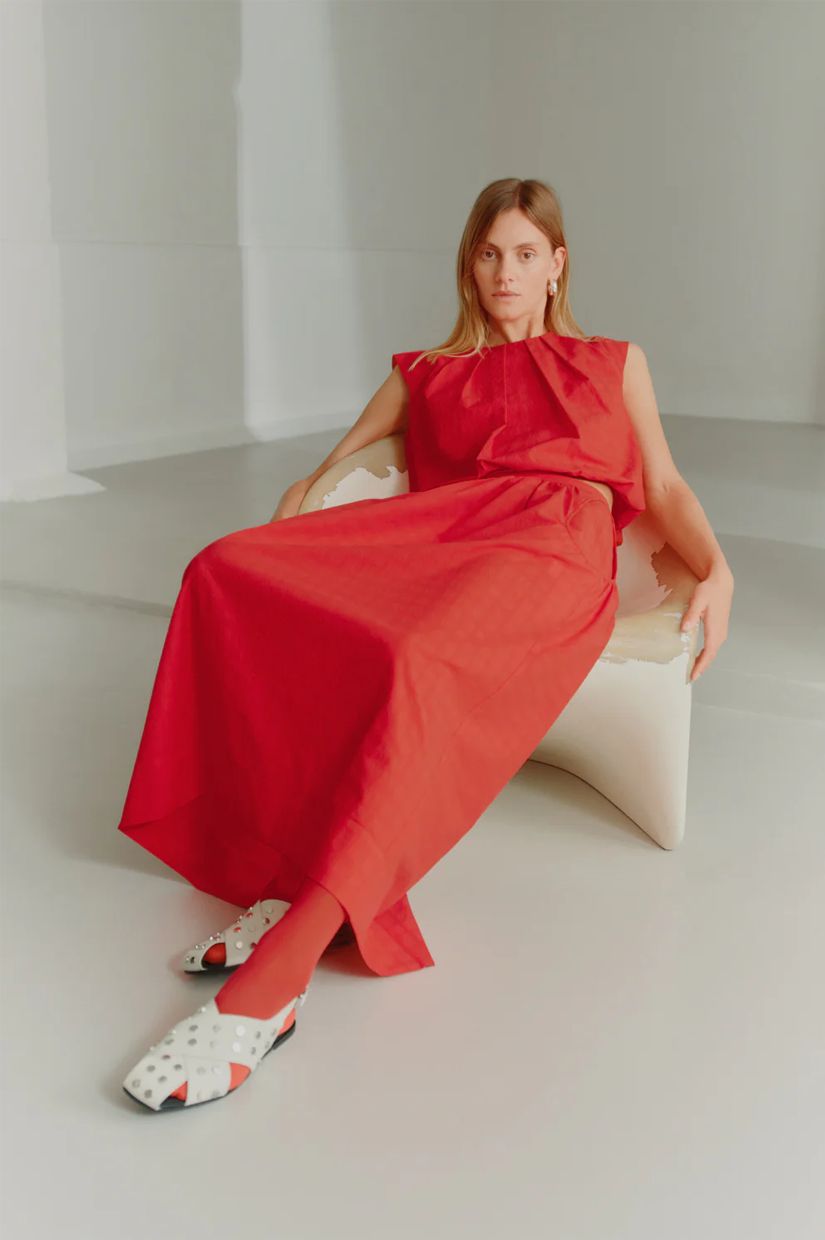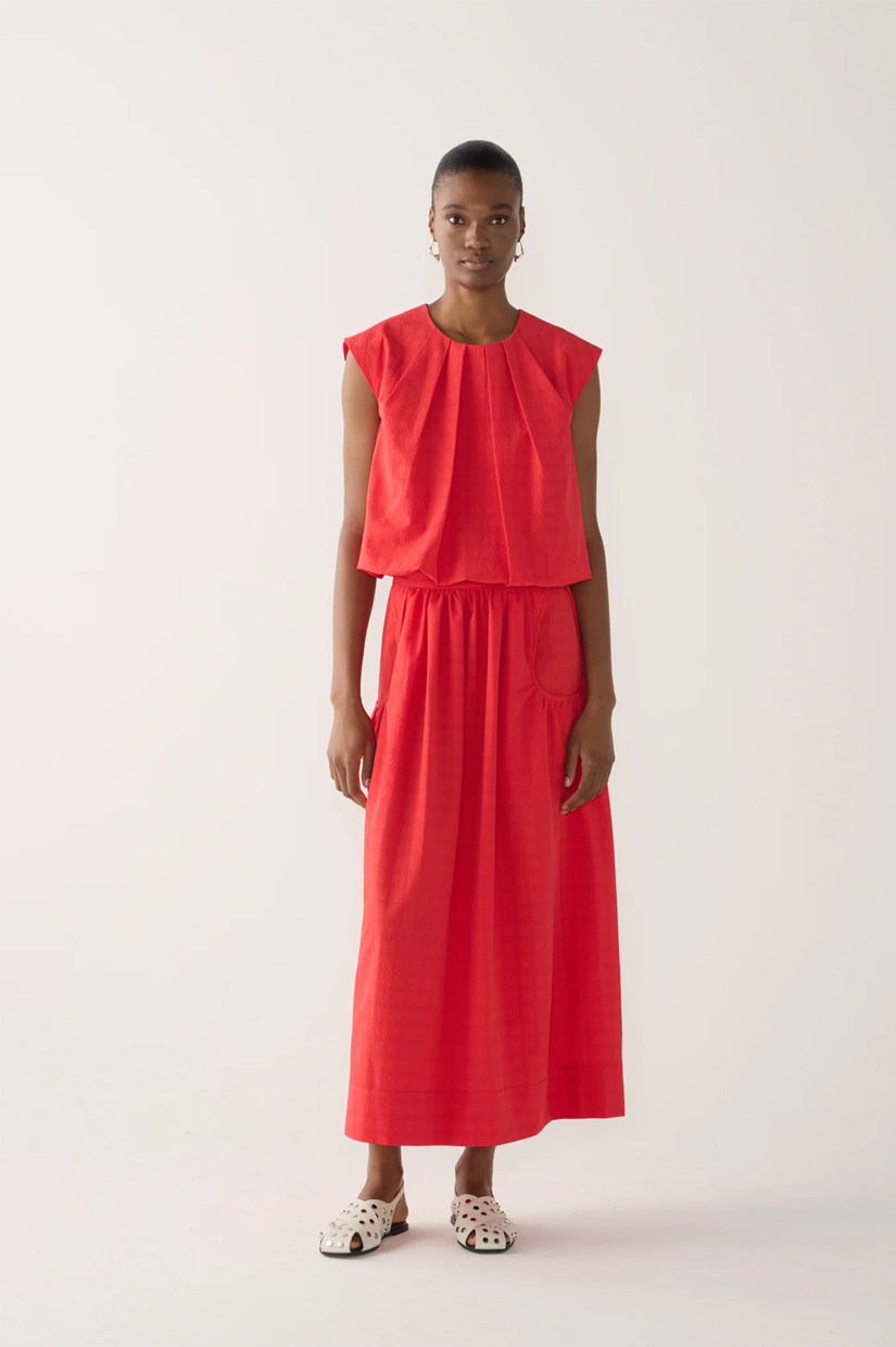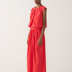 This sleeveless top is designed with soft gathers from the neckline that create gentle volume through the body. The silhouette is finished with a bubble hem that adds shape and ease, while a delicate button-and-loop closure at the back provides a refined finishing detail. Effortlessly minimal, it balances structure and fluidity.