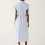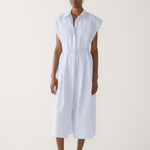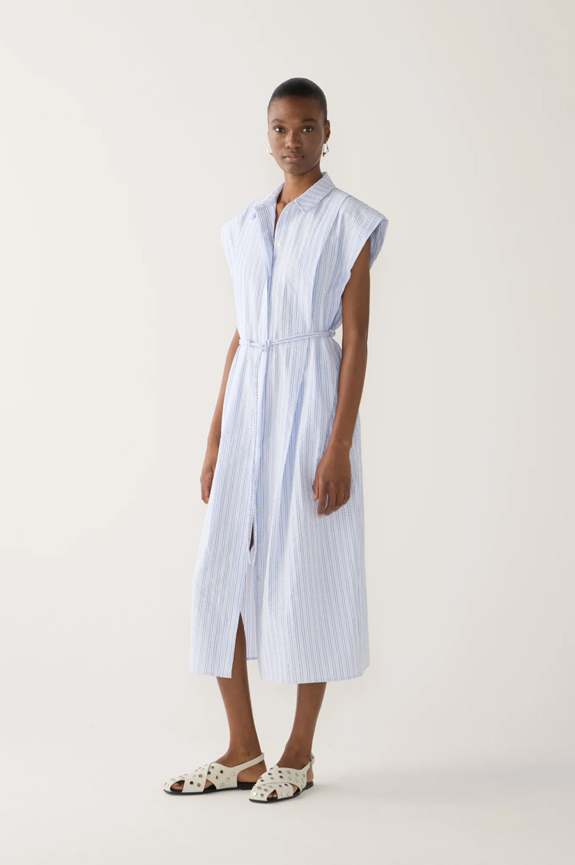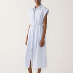 An elevated take on the shirt dress, this style is defined by its clean lines and subtle detailing. Cut to a midi length in a crisp blue pinstripe, it features a concealed placket for a streamlined finish. Pleats fall softly from the shoulder, opening into the skirt to create gentle volume and movement. A knotted rouleau belt cinches the waist, offering shape while maintaining an effortless feel.