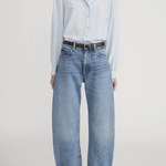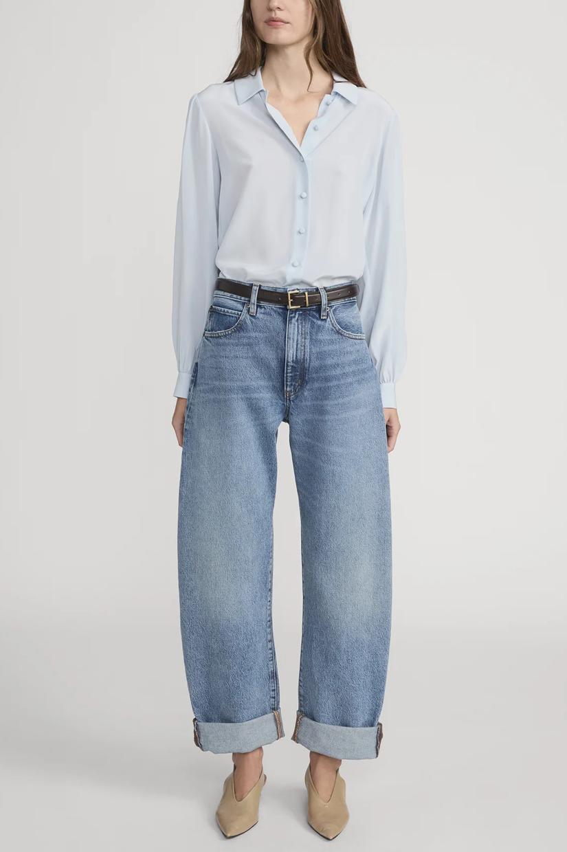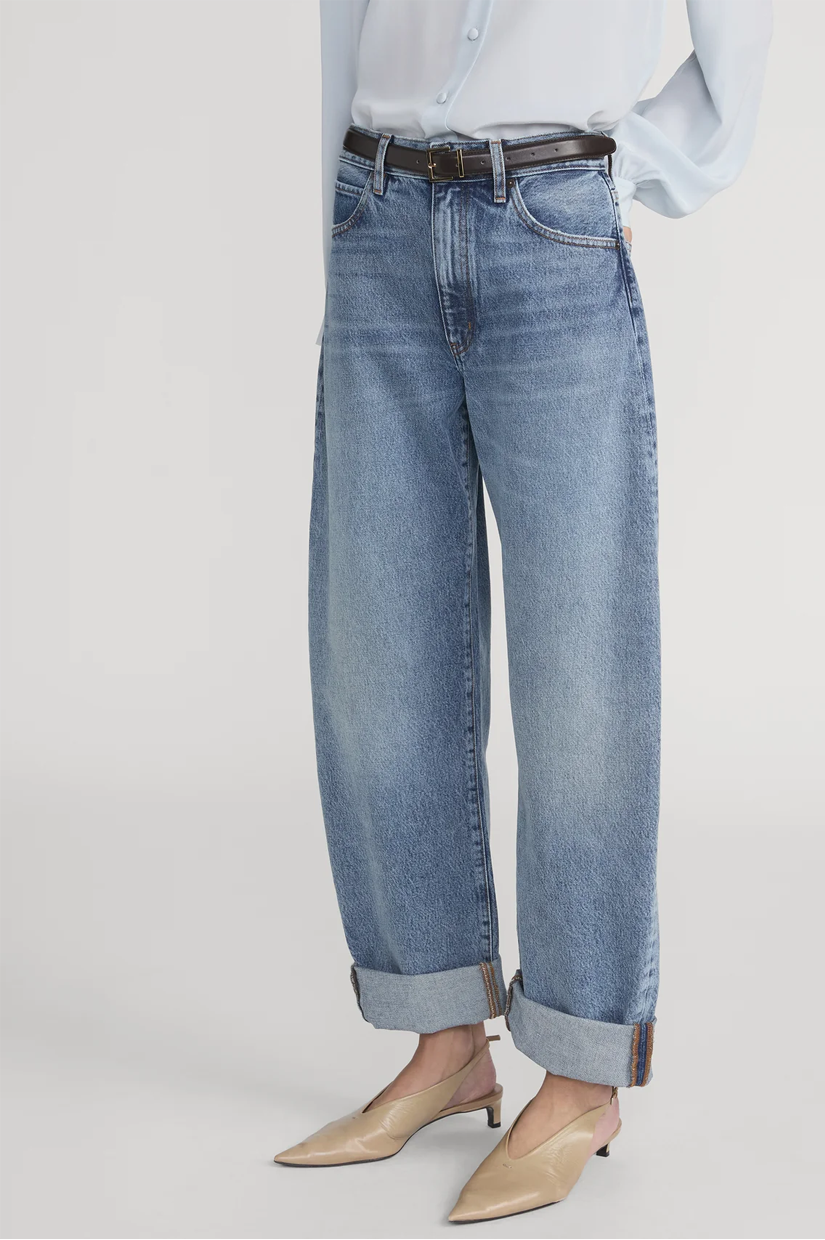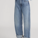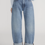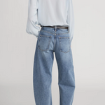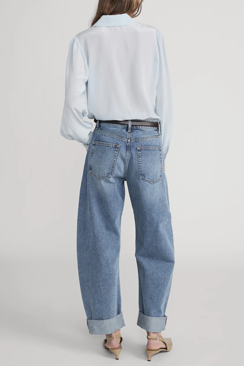 The Bubble features a unique curved outseam for a playful bubble effect. Crafted from non-stretch regenerative denim, with a flattering high-rise waist. Designed to be worn cuffed and hit at the ankle, the 2.5" twice-rolled cuff can also be unrolled for a longer, more dramatic inseam.