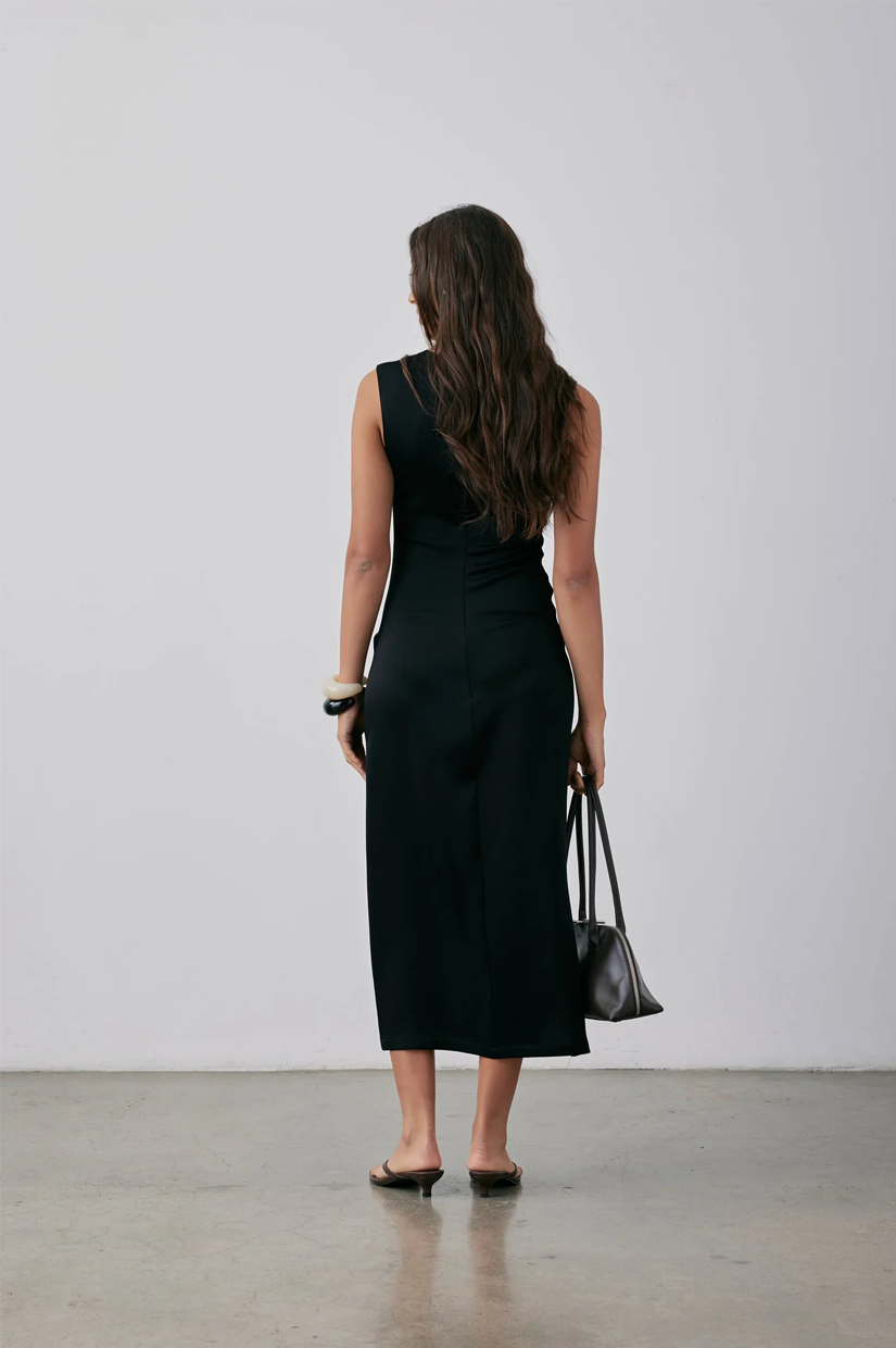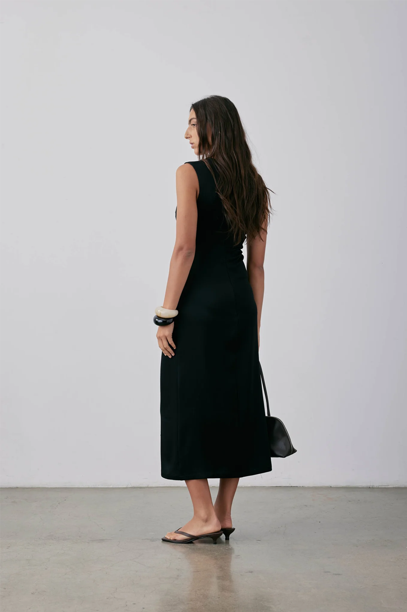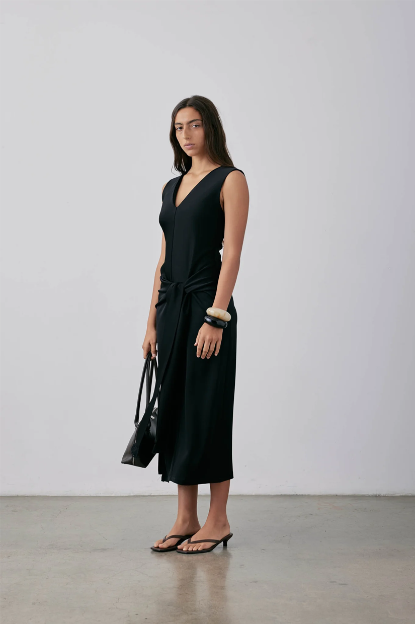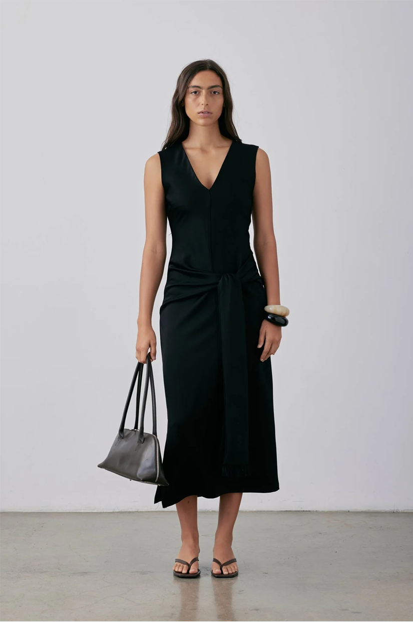 Discover understated elegance with the Berte Dress SS25. Made from luxurious Japanese triacetate, this streamlined piece boasts a v-neckline, tassel tie waist, and invisible zipper. Expertly crafted for a flawless silhouette.