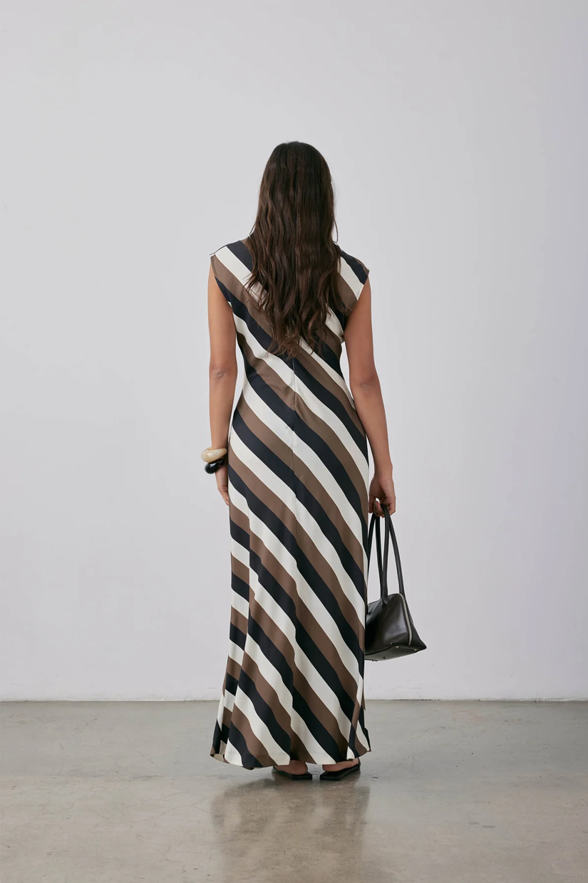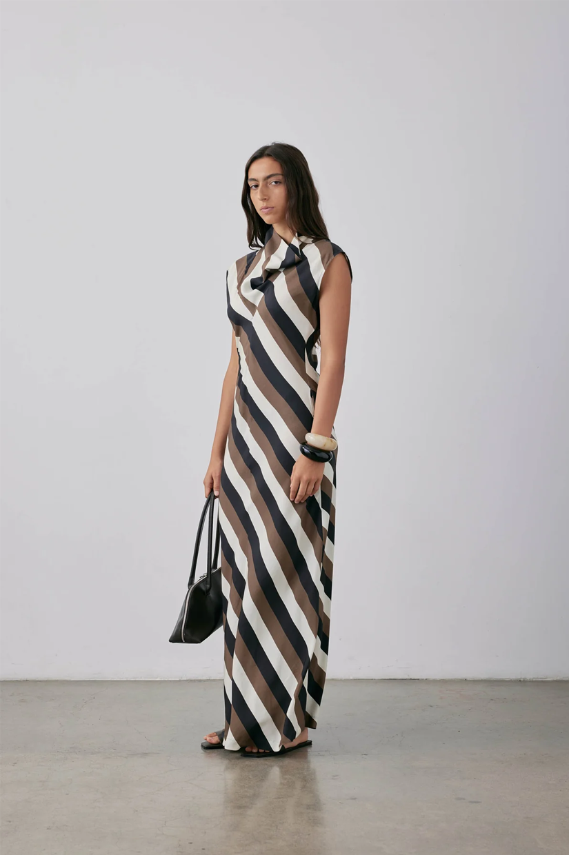 Elevate your look with the Ruffus Dress. A maxi-length silhouette cut on the bias for graceful movement and a flattering drape. Crafted from soft, sustainable Tencel twill, this Coco stripe dress is perfect for special occasions, blending effortless elegance with modern charm.