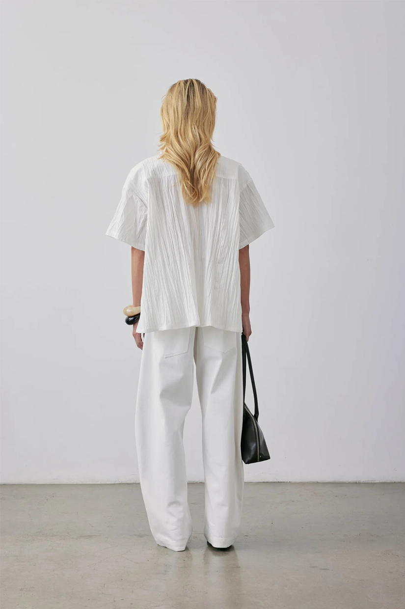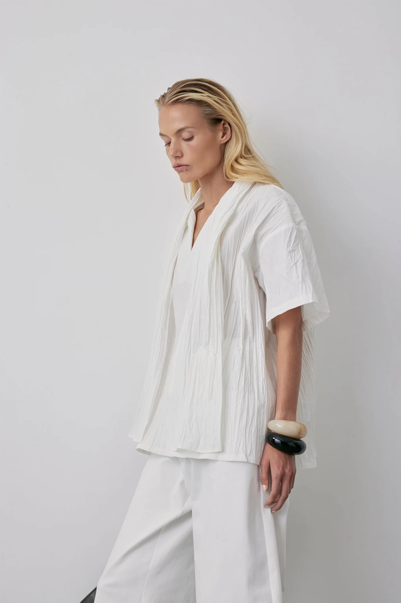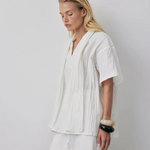 Experience elevated style with the Sion Top SS25. Crafted from luxurious crisp pleated cotton, this top features a versatile scarf for endless styling possibilities. Indulge in high-quality comfort and effortlessly elevate your wardrobe with this must-have piece.