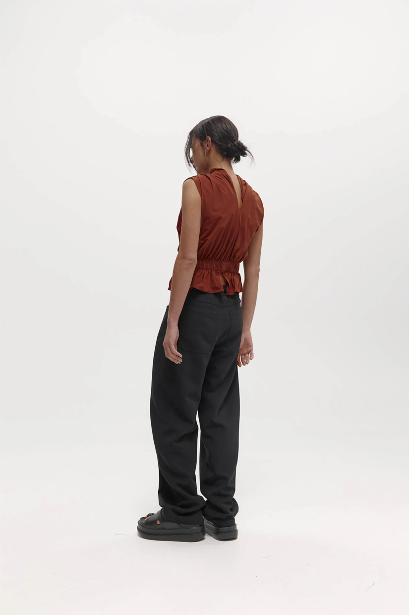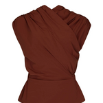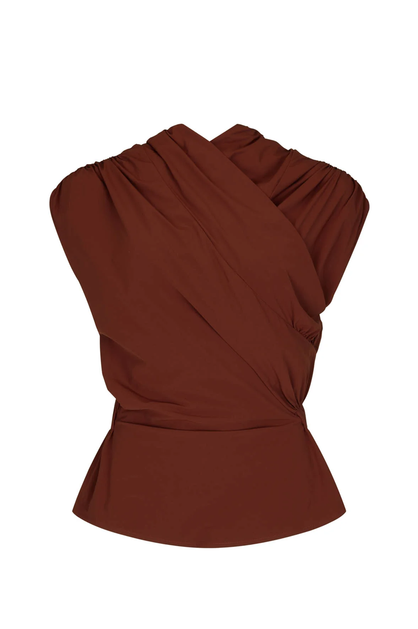 Echoing sculptural forms, a sleeveless wrap top in stretch nylon with gathered shoulders and draping across the front. Elasticated waist adds shape and ease through the silhouette