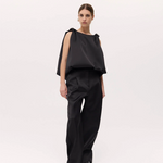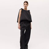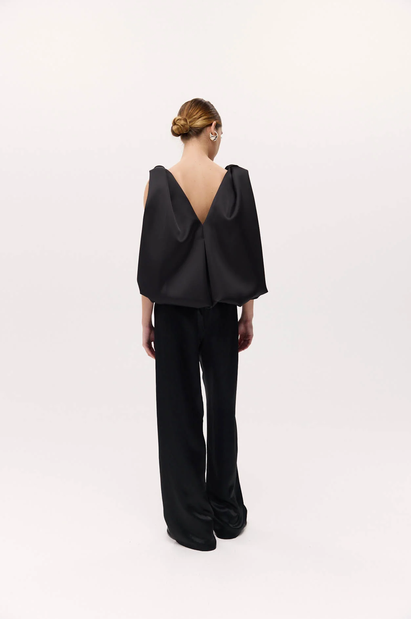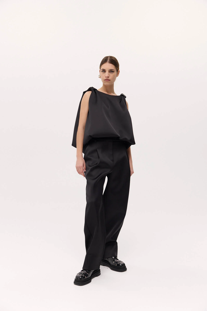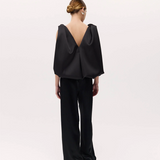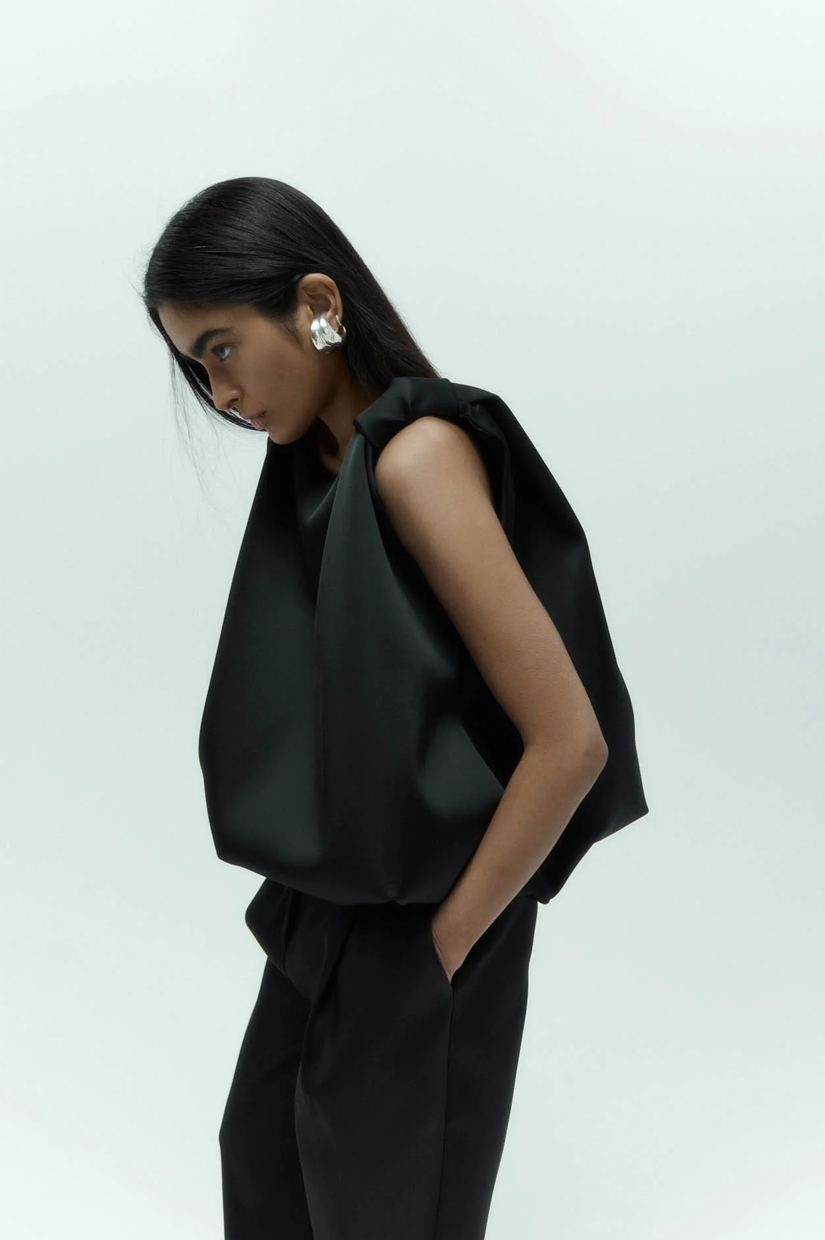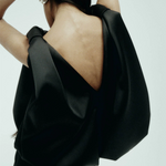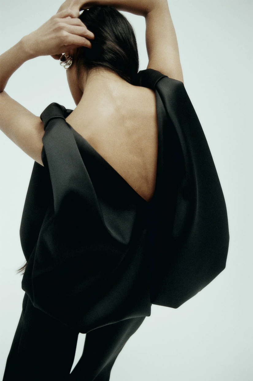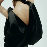 Knot shoulder details are an ode to '60s couture silhouettes. Fully lined with a bubble hem. Crafted from structured black bonded satin.
