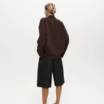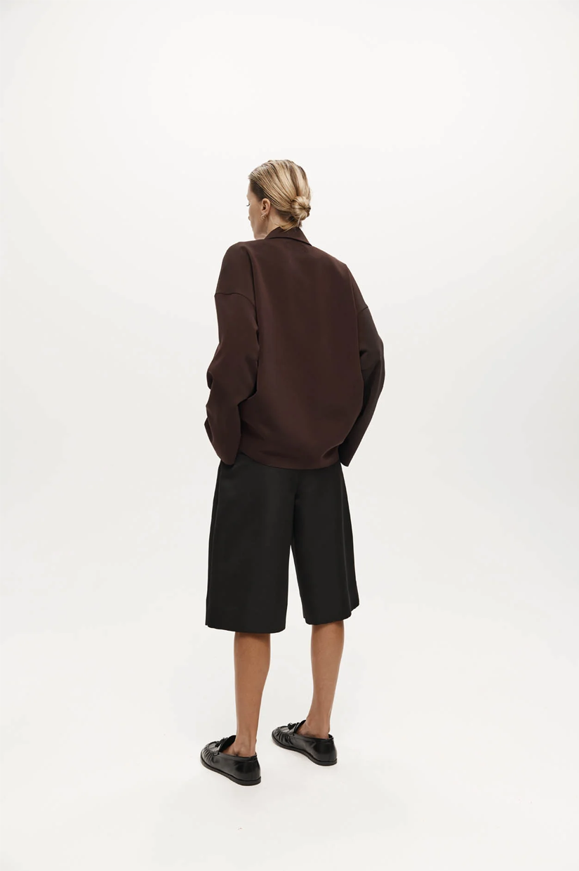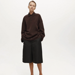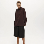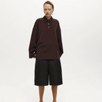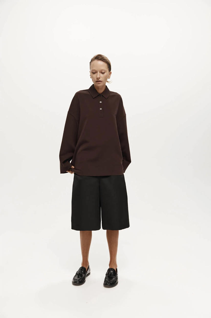 A long sleeve polo cut in a relaxed silhouette. Features a pointed collar, three-button placket, and dropped shoulders. Finished with elongated sleeves and a straight hem.