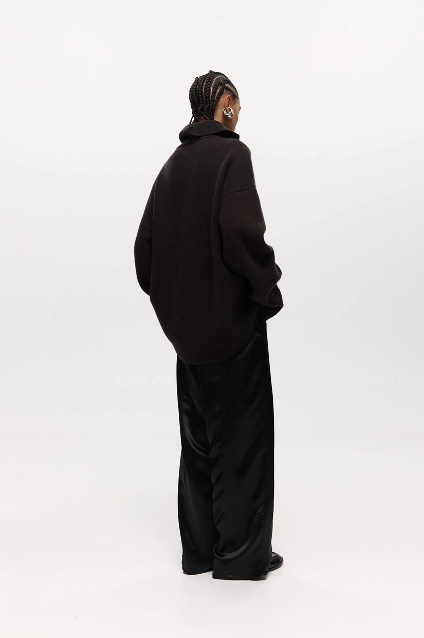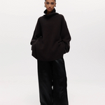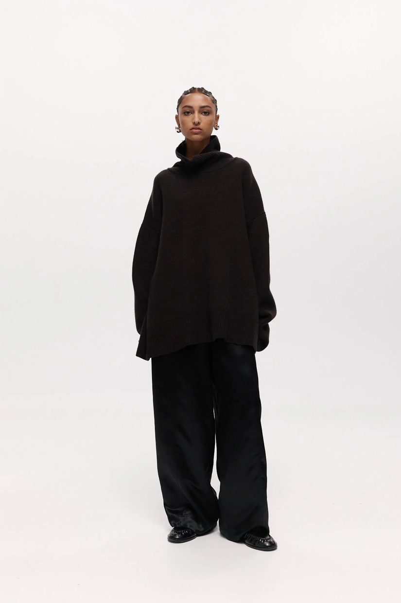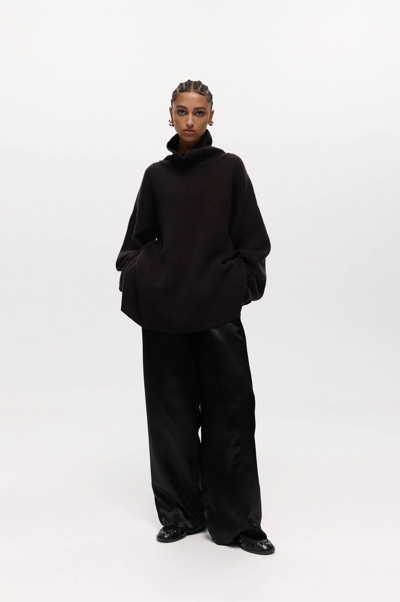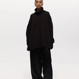 An oversized funnel-neck jumper in a soft cashmere blend. Features long sleeves, dropped shoulders, and a relaxed silhouette.