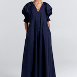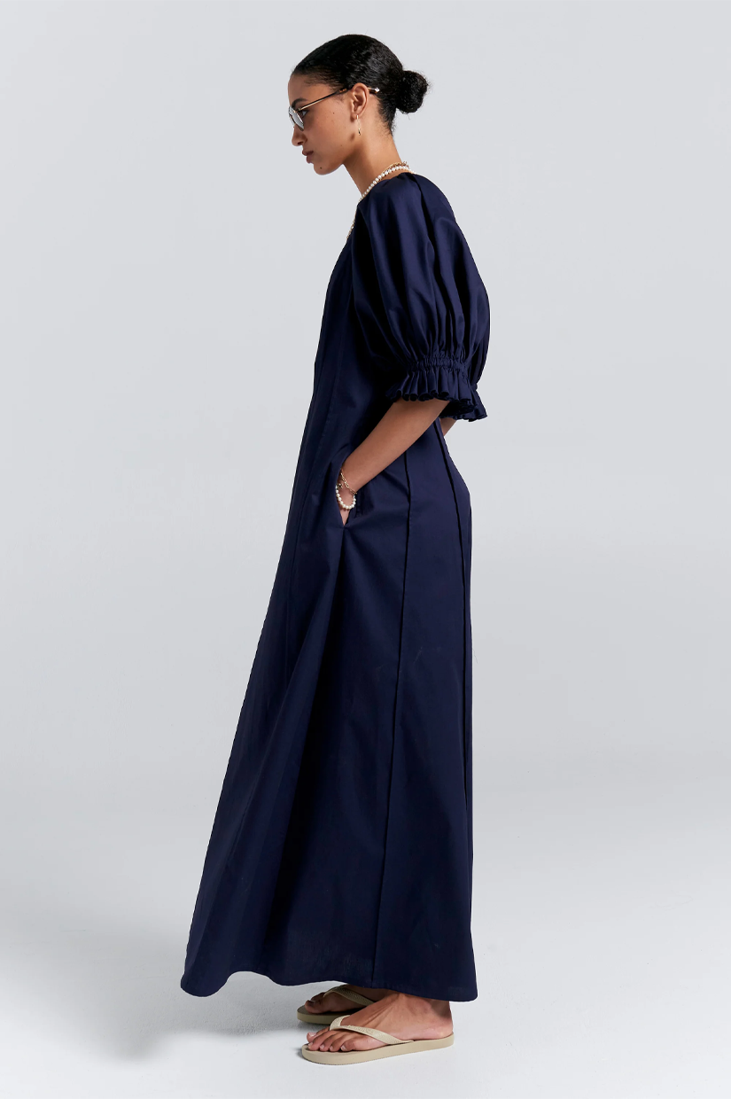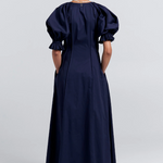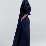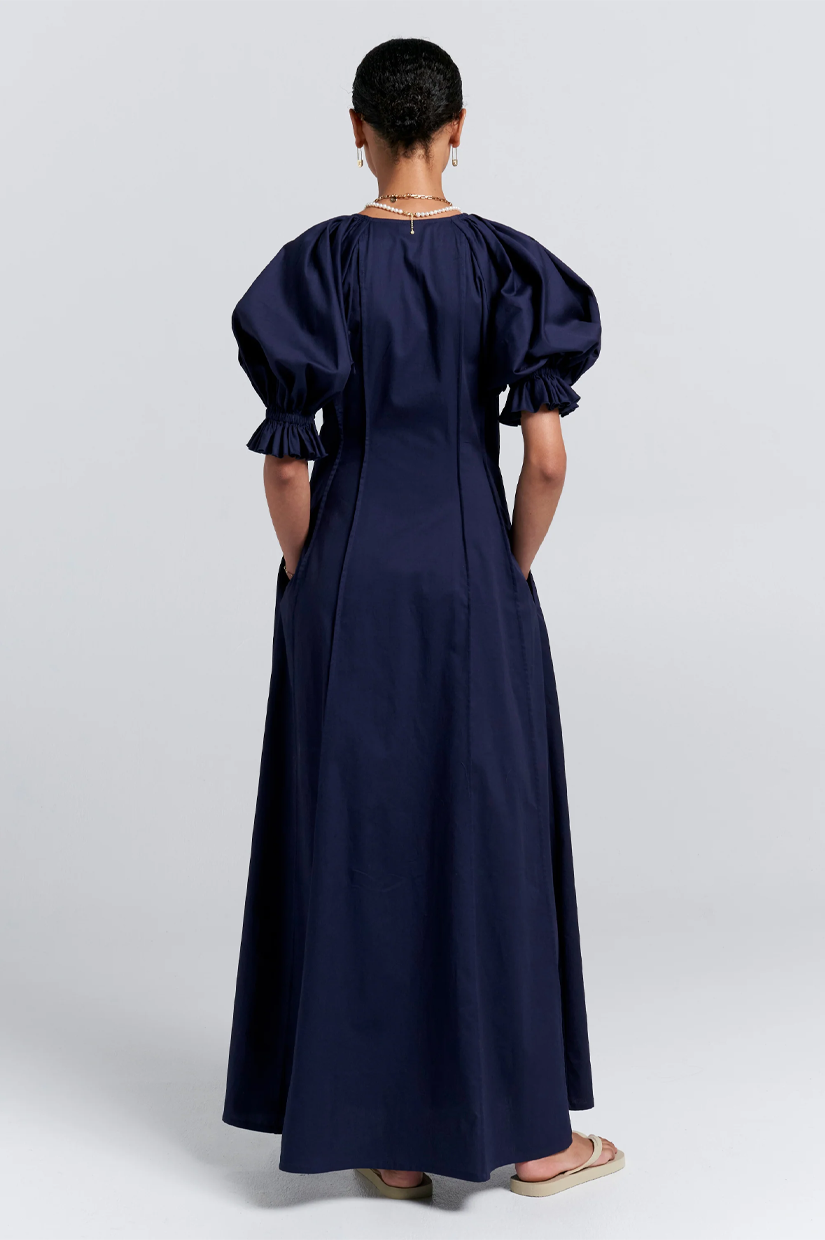 Puffed with wonder, the Melody Dress, crafted in organic cotton, features skywards reaching sleeves blooming with romance and neatly cinched-in at the elbow. The beloved style is now offered in a ‘Perfect Day’ deep navy. Structured linework around the bodice, alongside gold-tone buttons create a form fitting silhouette, while an invisible zip adds ease when putting it on. Pockets at the waist add discreet utility, while neatly tucking pleats open to a generously flowing midi length hem.