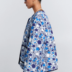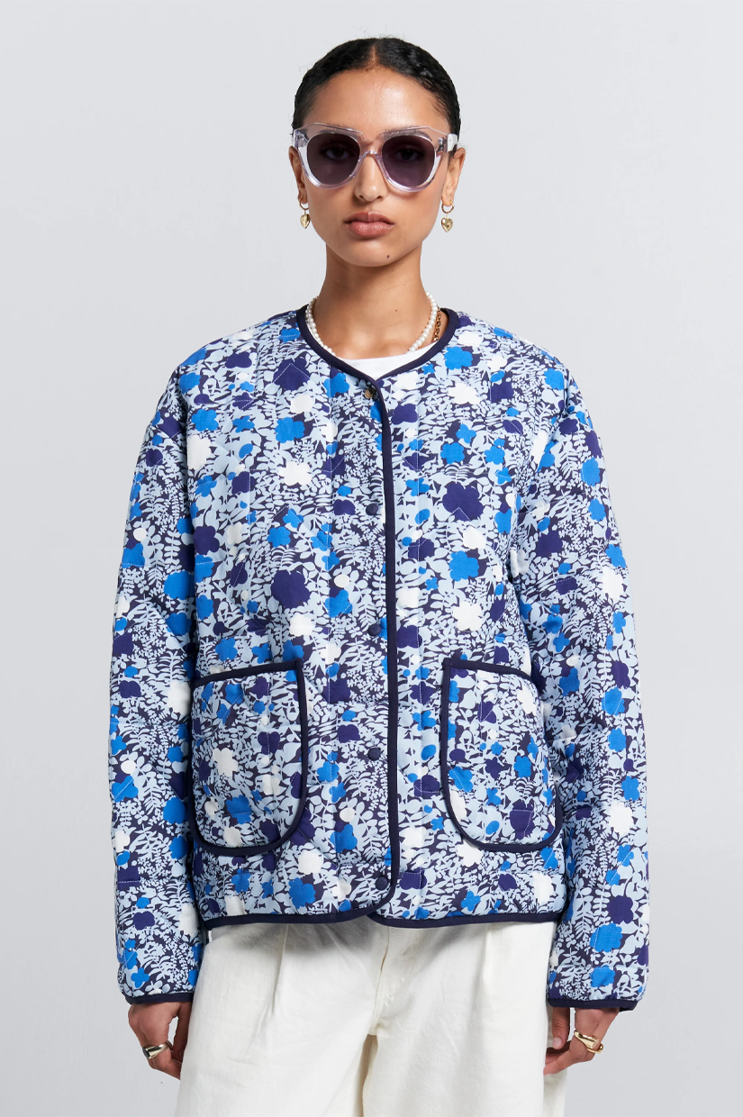 The Quilted Drift Jacket is reimagined in the Karen Walker Perfect Day Floral, now in fresh blue tones. Cut in a breathable Tencel-linen blend with a soft recycled fill, it delivers lightweight warmth in a relaxed, boxy silhouette. Snap-button closure, front patch pockets, and contrast binding finish the design.