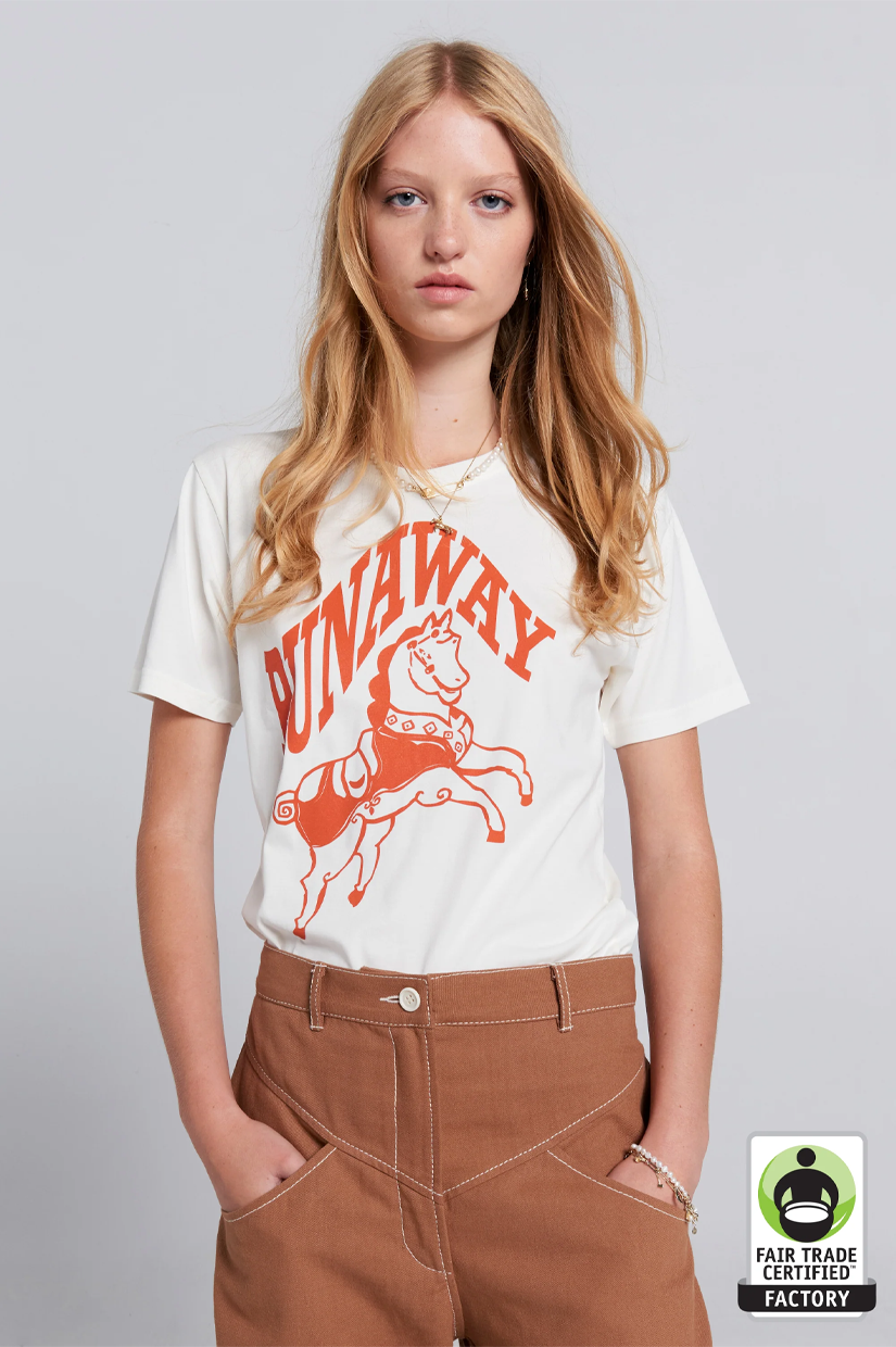 The Runaway Carousel Organic Cotton T-shirt captures the playful spirit of the fair, featuring the Karen Walker Carousel Horse leaping from its post. This tee brings a chic yet whimsical edge to everyday dressing.