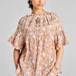 The theia Smocked Blouse highlights intricate smocking at the neckline and sleeves, creating soft texture and detail. Cut from crinkle organic cotton in the beloved Perfect Day print, a warm and whimsical floral, it falls with a relaxed ease that makes it both versatile and unmistakably KW.