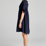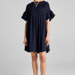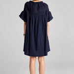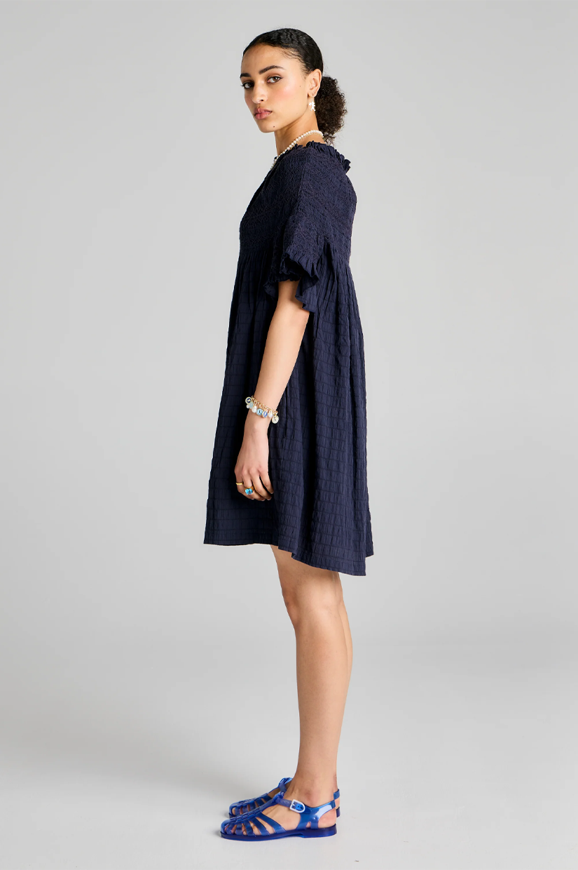 reinterprets our classic shirred silhouette with a playful twist. Adorned with exquisite smocking at the bodice and sleeves, this dress is made from crinkle organic cotton, offering a relaxed fit that perfectly balances comfort and style. Its sweet mini length adds flair, making it a delightful addition to your wardrobe.