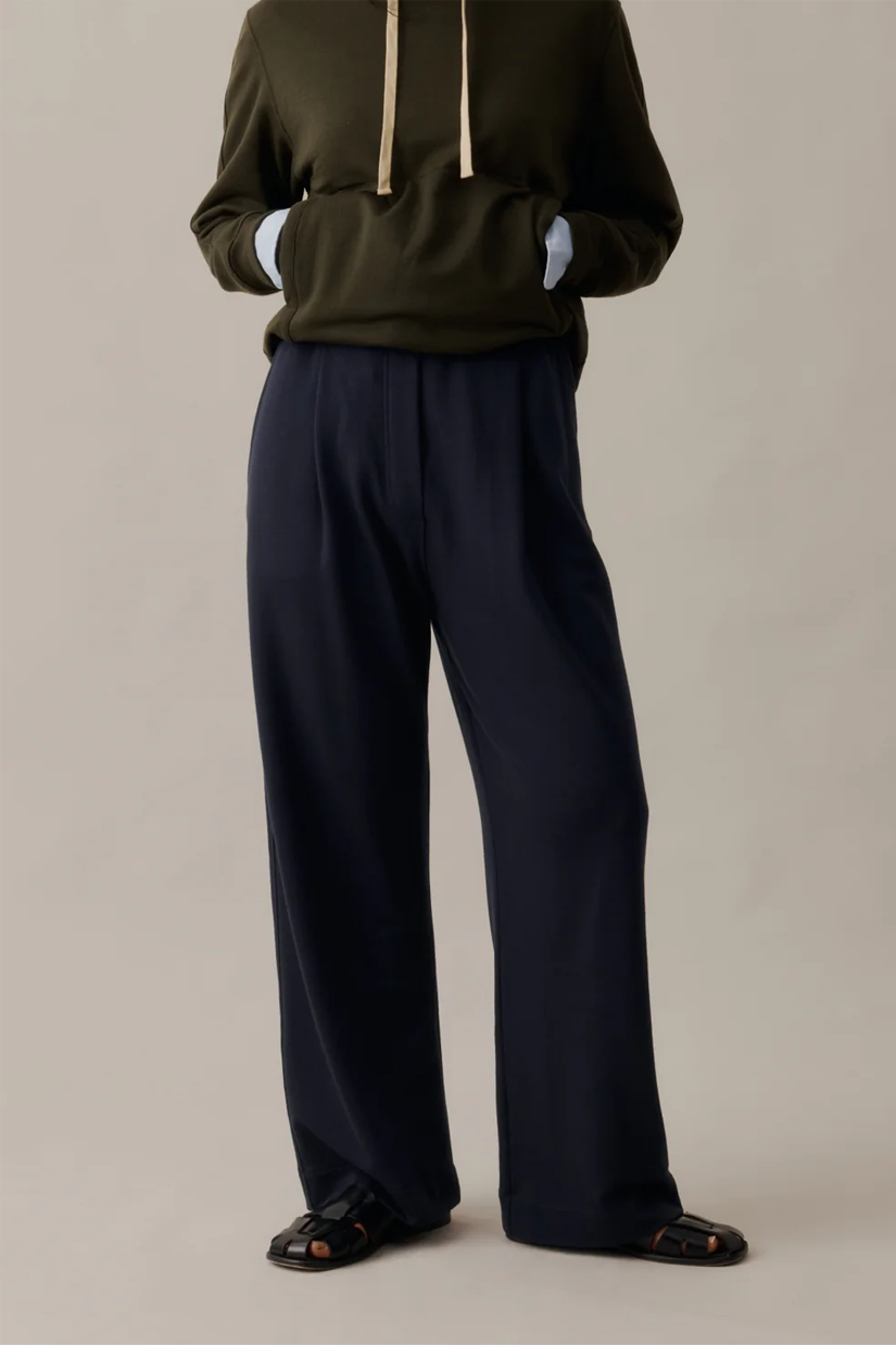 The Wide Leg Merino Pant is a luxurious take on a relaxed fit. Crafted from our 100% ZQ merino loopback terry, they are designed with a wide leg silhouette to sit on the hip with a deep pleat on the front leg. This pant features an elasticated waist with beltloops, two side angle front pockets and a patch pocket on the back right leg. The are finished with a folded and stitched hem, bound inner waistband and an embroidered Longform Merino moniker on the front left pocket.