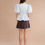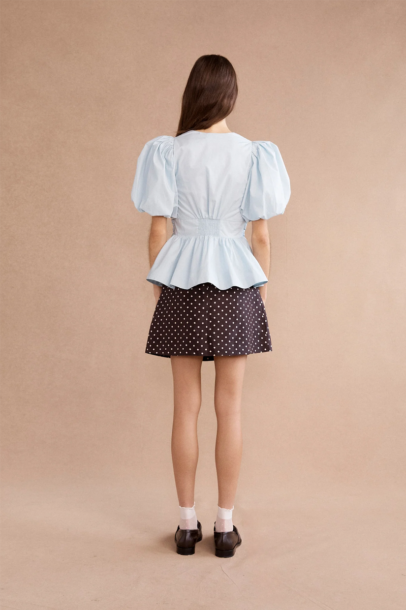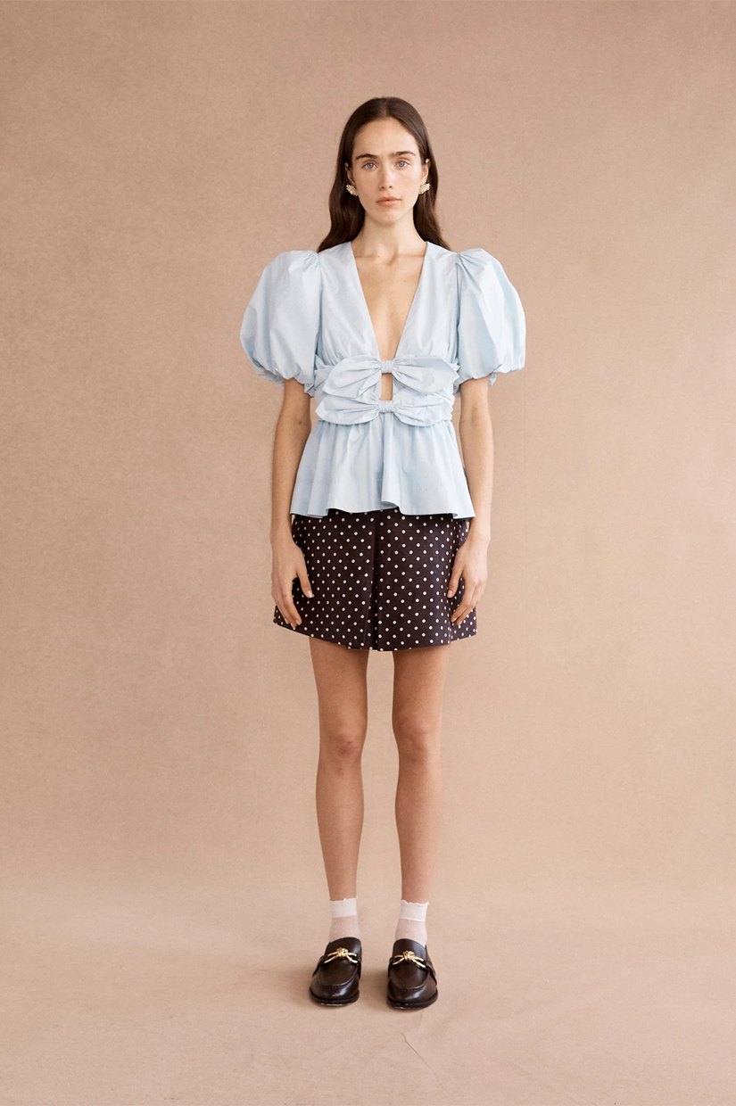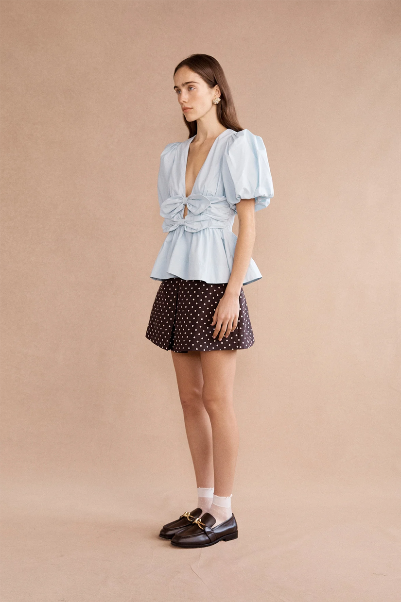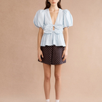 The Devon top in cornflower blue is made from butter-soft cotton poplin, featuring double bow front details, blousy puff sleeves and a flattering deep V-front neckline.