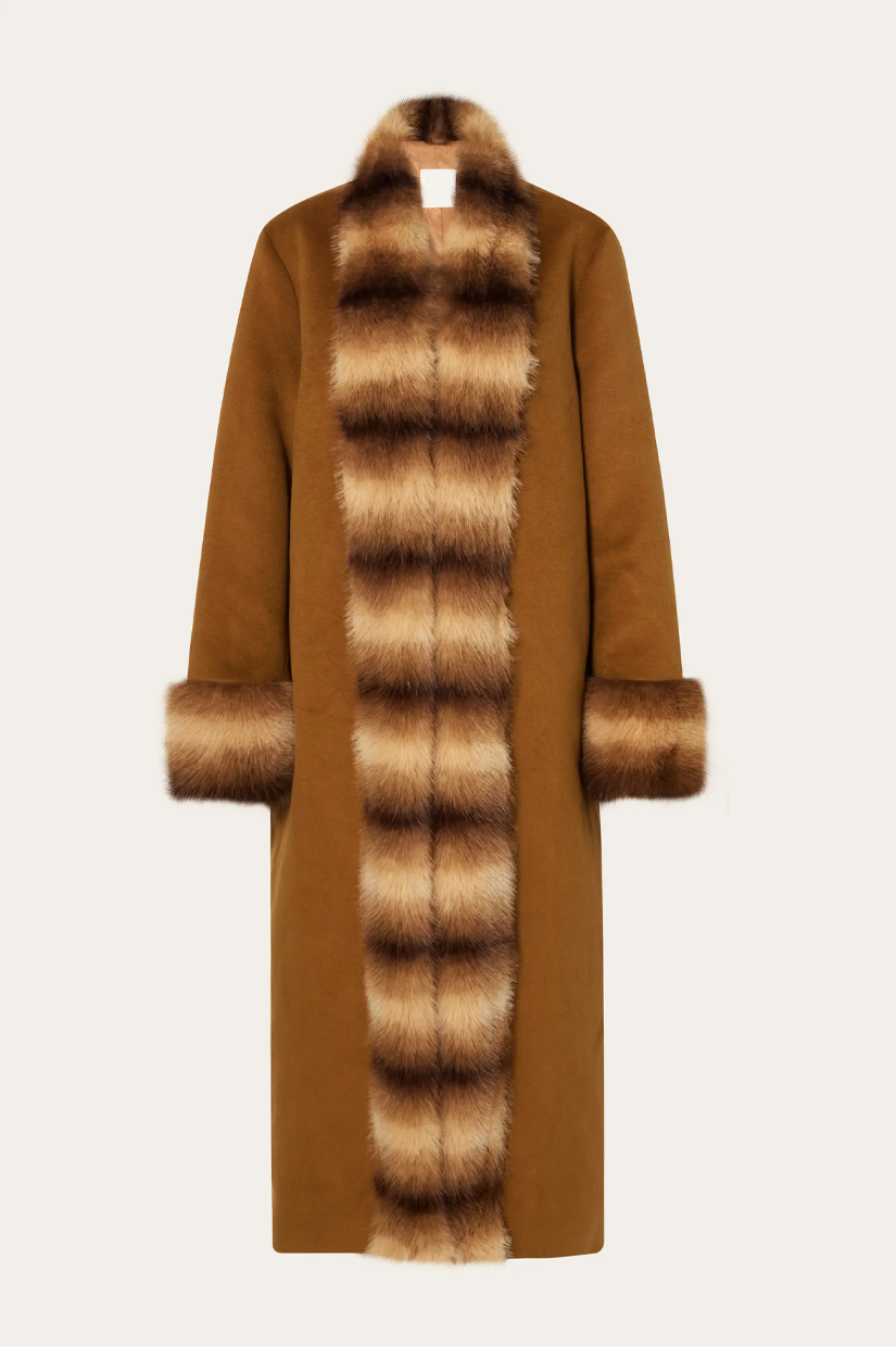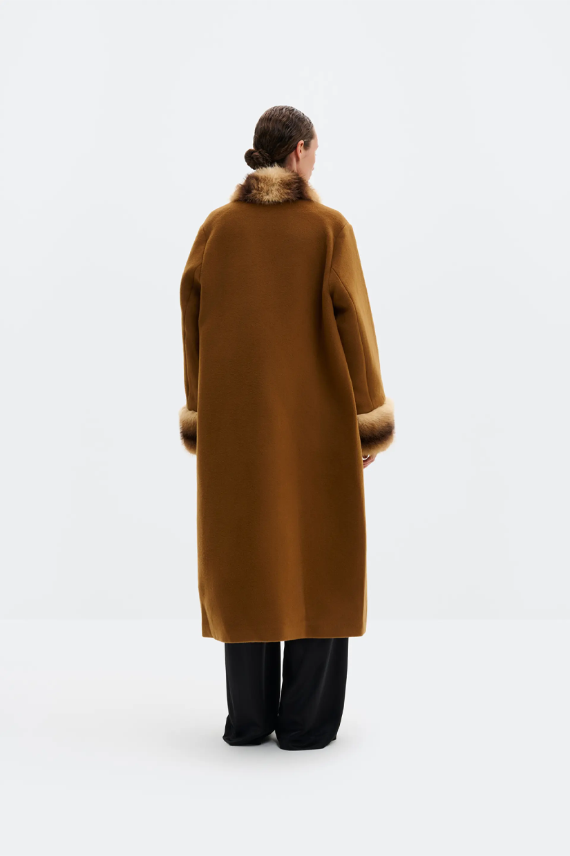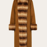 Long, open wool and cashmere blend coat with faux fur details.