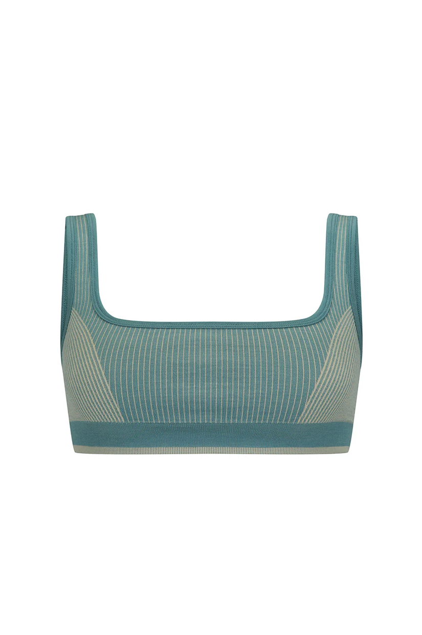 Superfine Merino wool bralet in signature Nagnata rib crafted in our seamless knitting technique, offering mild compression and support. The square neckline is complemented by a detailed contrast jacquard stripe and Nagnata logo on the back hemband. This style is fully lined for additional support and a super-soft second-skin feel against the body.