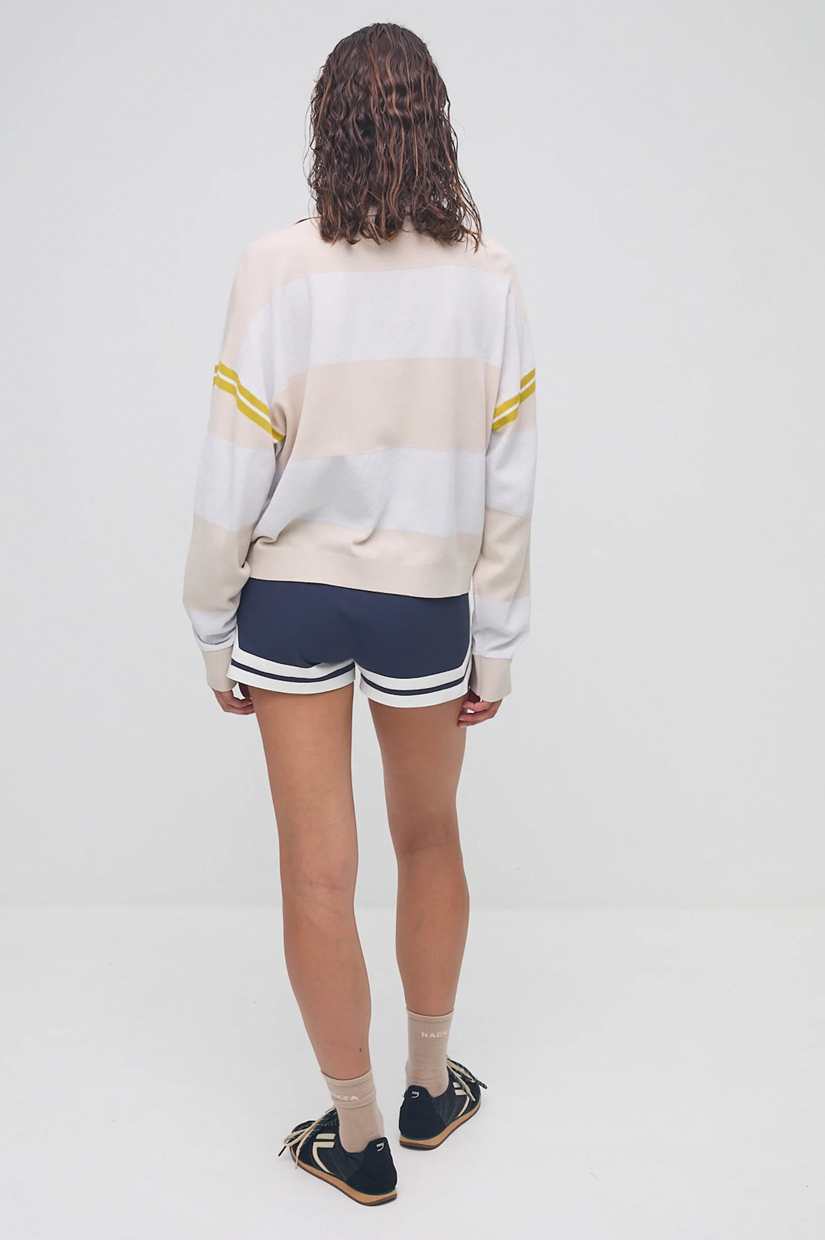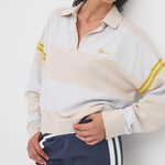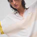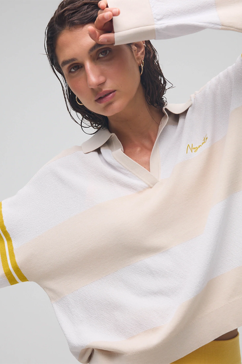 The Ivy polo is a relaxed longsleeve, cropped polo jersey featuring statement Nagnata embroidery and intarsia stripe pattern on body and sleeves. Finished with a Milano knit collar and placket, this style is made with 100% organic cotton and styles back perfectly with both our movement and fashion styles.