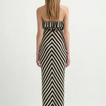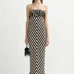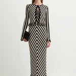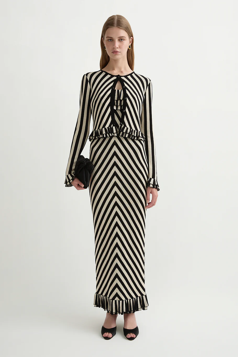 The Miles Dress is crafted from a soft knit, featuring directional cream and black stripes. Designed with bust and hem frill details, it has a close, figure-hugging silhouette. Pair yours with the Miles Cardigan.