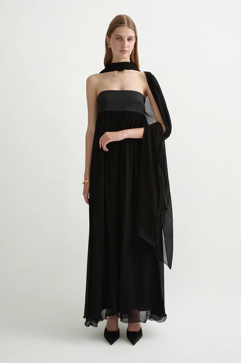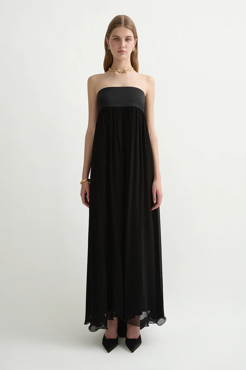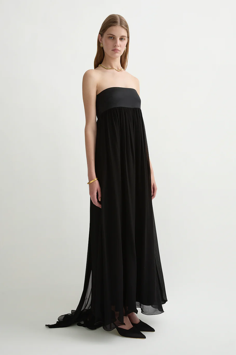 Designed in a strapless silhouette, the Solene Dress features a contrast bodice that falls from the underbust into a full maxi skirt. An elegant train falls from the centre back, allowing multiple styling options.