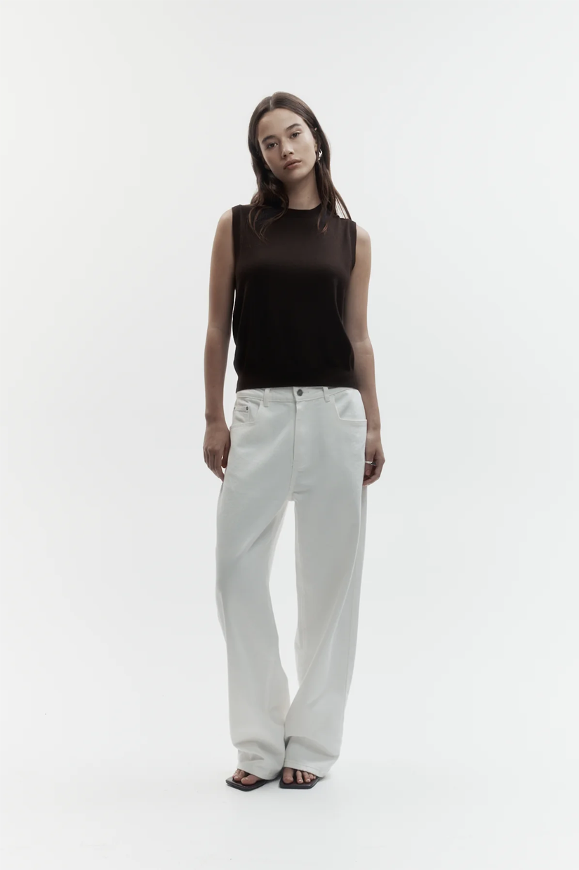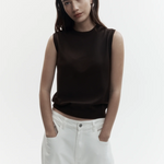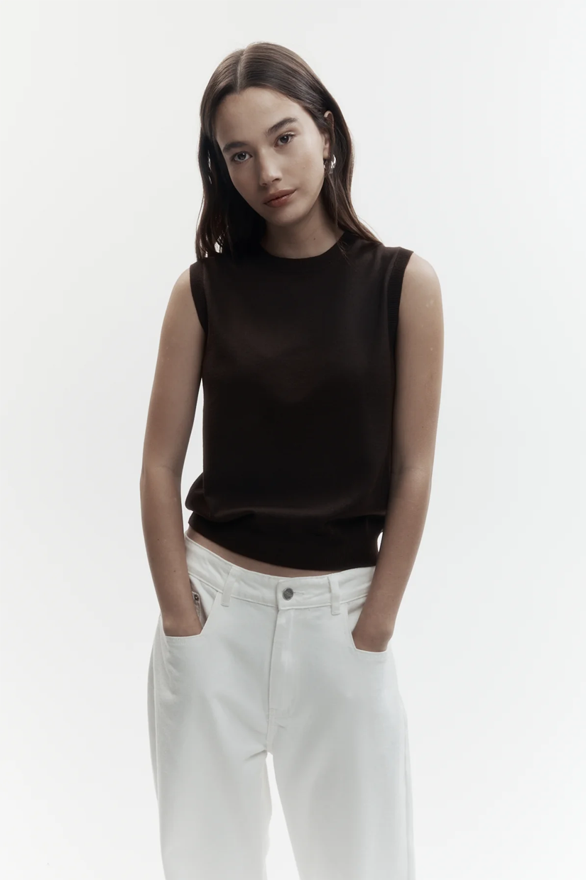 A sleeveless merino vest knitted from fine Australian-sourced wool, cut to a tidy silhouette for refined layering, in a rich ganache hue.