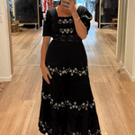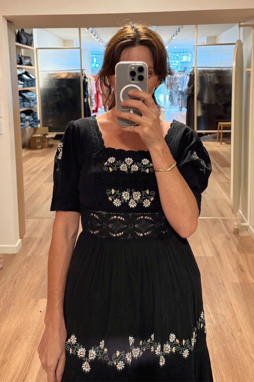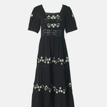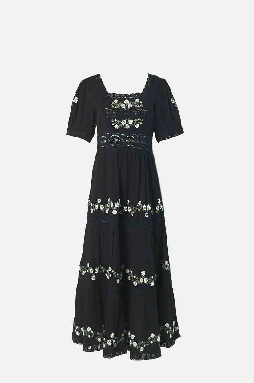 The Philippa Dress in black from Rixo is vintage-inspired and offers a soft shape that is enhanced by its crepe fabric, generous maxi-length and short, puffed sleeves. With tiered floral embroidery and repeating lace inserts, this dress has artisanal charm and timeless elegance.