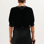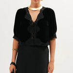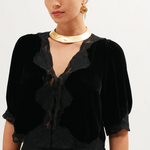 We think Ursula is the perfect party top - wear it with jeans or over our Clarice or Sandrine dresses. It's made from silk-rich velvet that's trimmed with lace and a satin bow for our signature vintage charm.