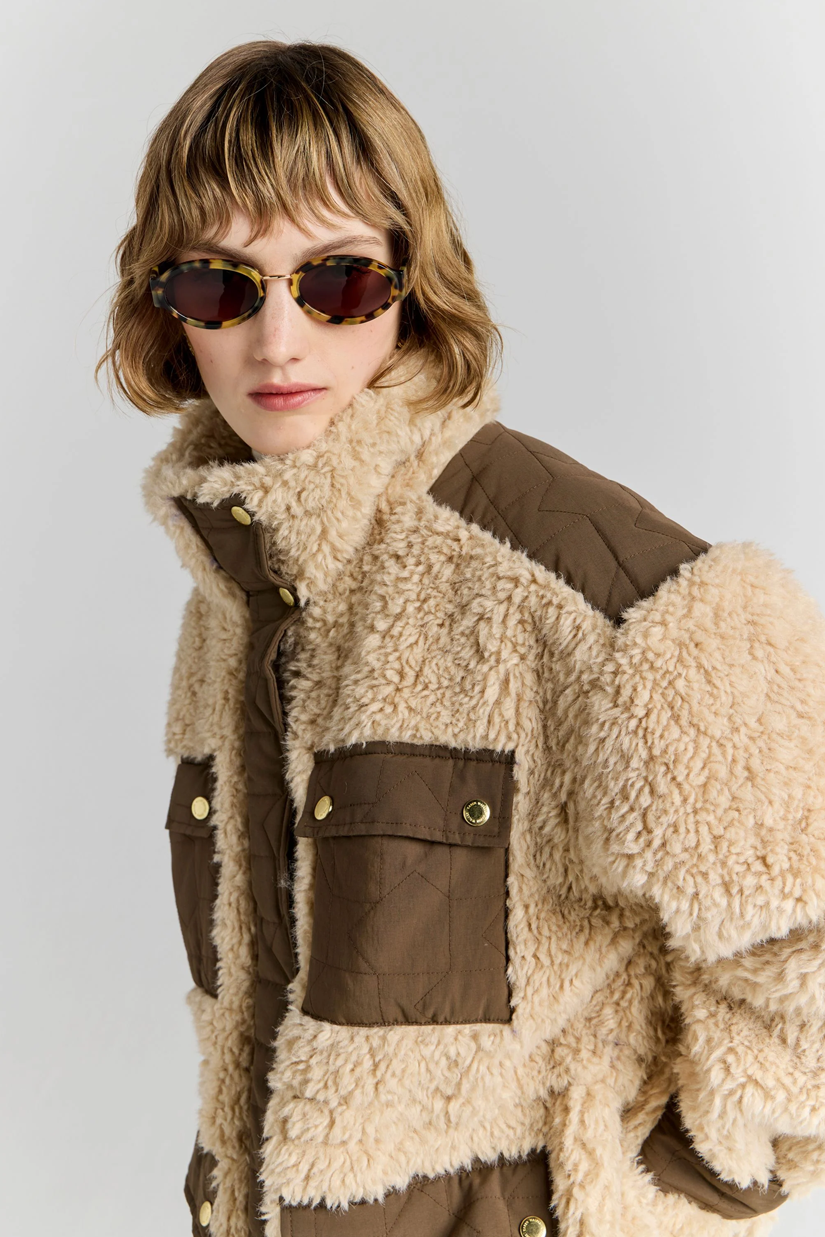 Long-sleeved shirt with a loose fit and curved sleeves. Button closure on the front and buttoned cuffs. Rounded hem. Draped detailing below the collar. Neck yoke seam. Main material made from 100% organic cotton.